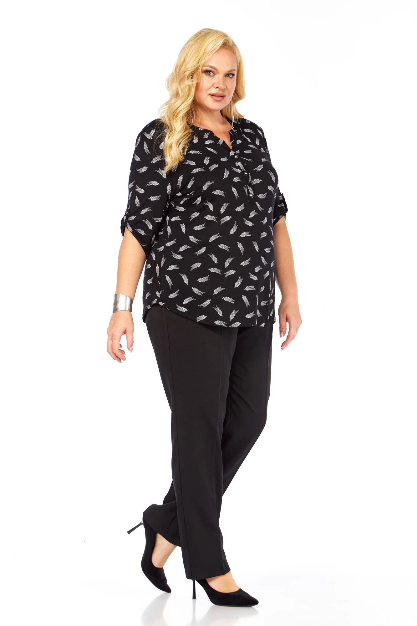 Детали, продуманные до мелочей, делают эту блузку безупречной. Округлая горловина с декоративной планкой и пуговицами добавляет утонченности. Декоративный шов по спинке с мягкой сборкой обеспечивает идеальную посадку и дополнительный объем. Тонкие подплечники формируют красивую линию плеч, улучшая осанку. А асимметричный низ с легким закруглением делает модель универсальной: ее можно носить как навыпуск, так и частично заправленной.