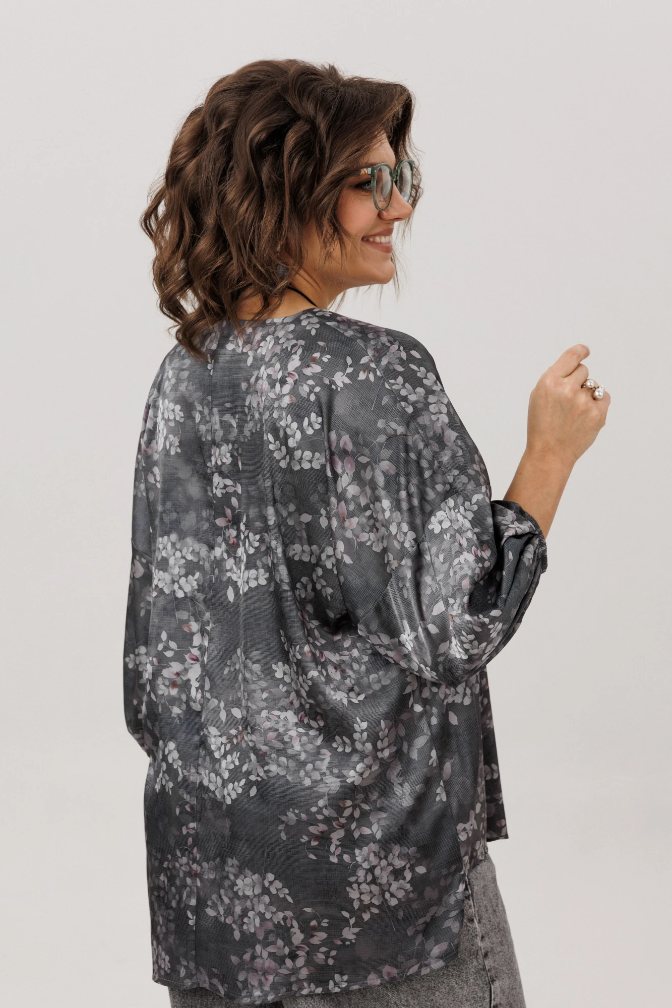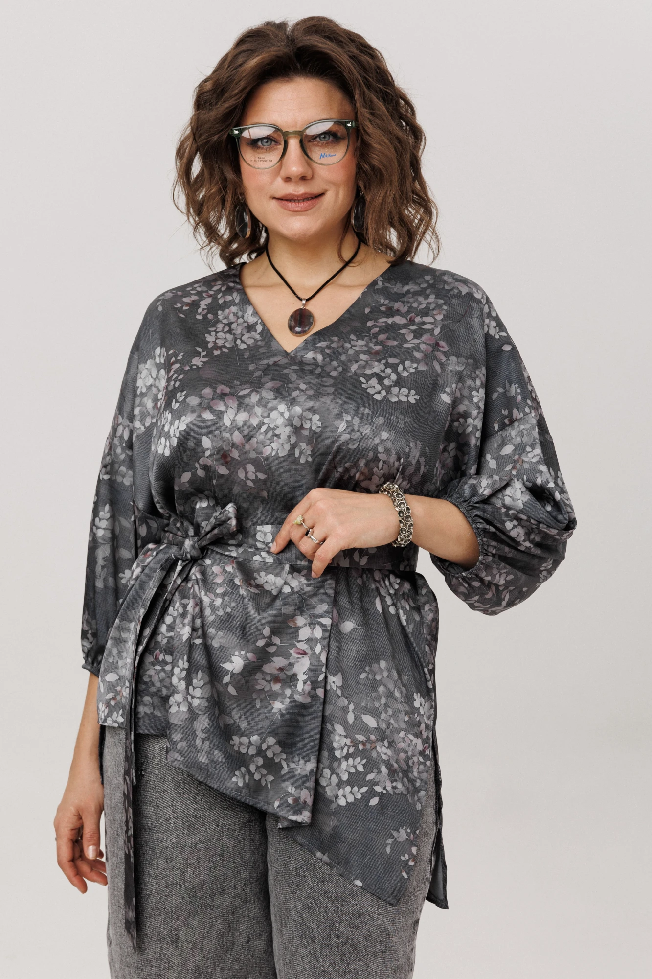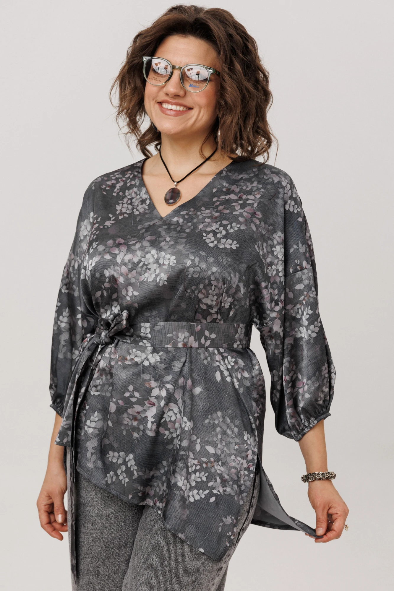 Главная особенность этой модели — продуманная многозадачность. Пояс в комплекте позволяет вам самостоятельно создавать нужный образ: затяните его, чтобы подчеркнуть талию и создать фигуру «песочные часы», или отпустите для расслабленного силуэта в стиле бохо. Завершает картину асимметричный низ с разрезом — деталь, которая делает блузу по-настоящему уникальной и визуально вытягивает силуэт.