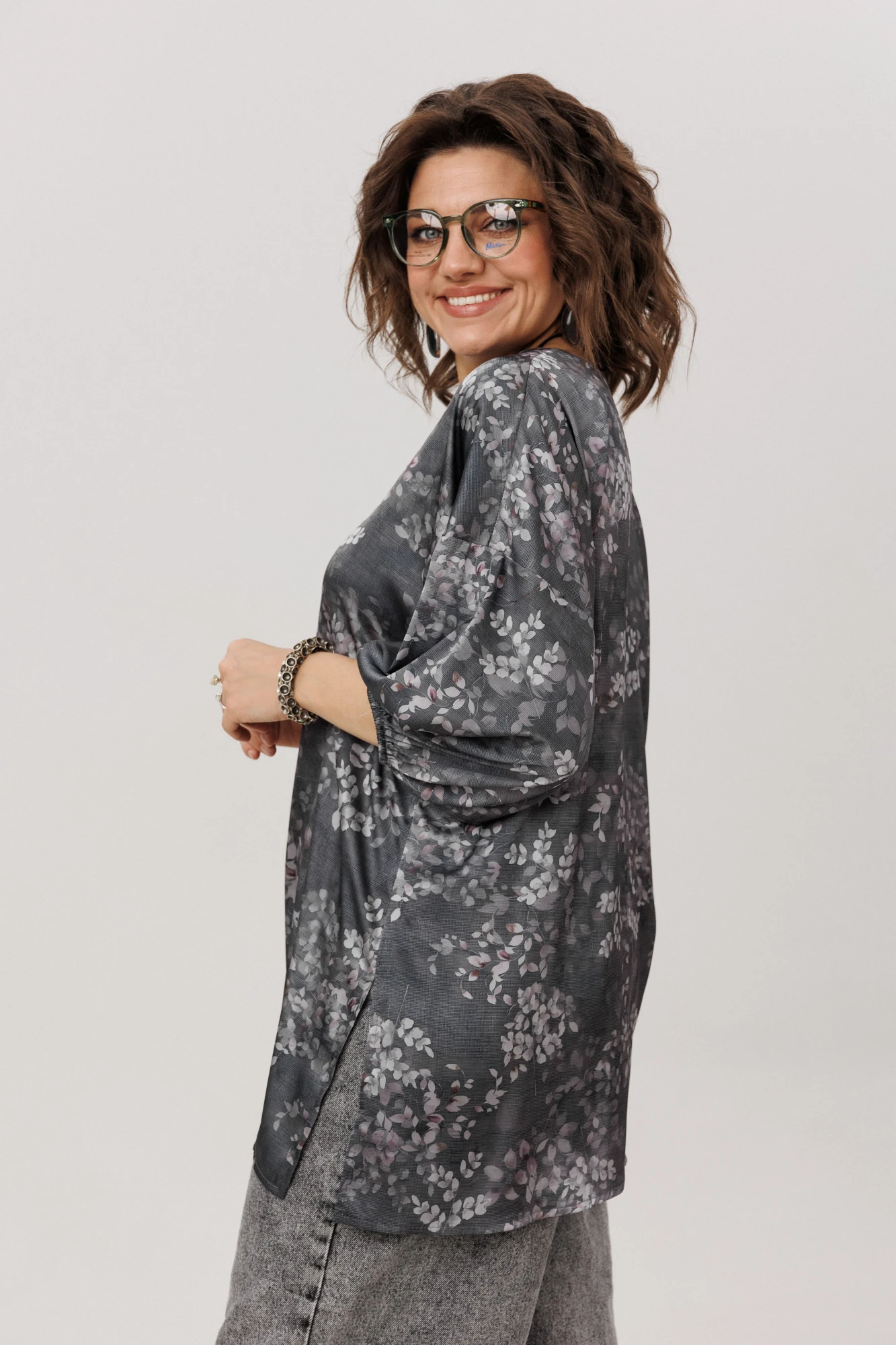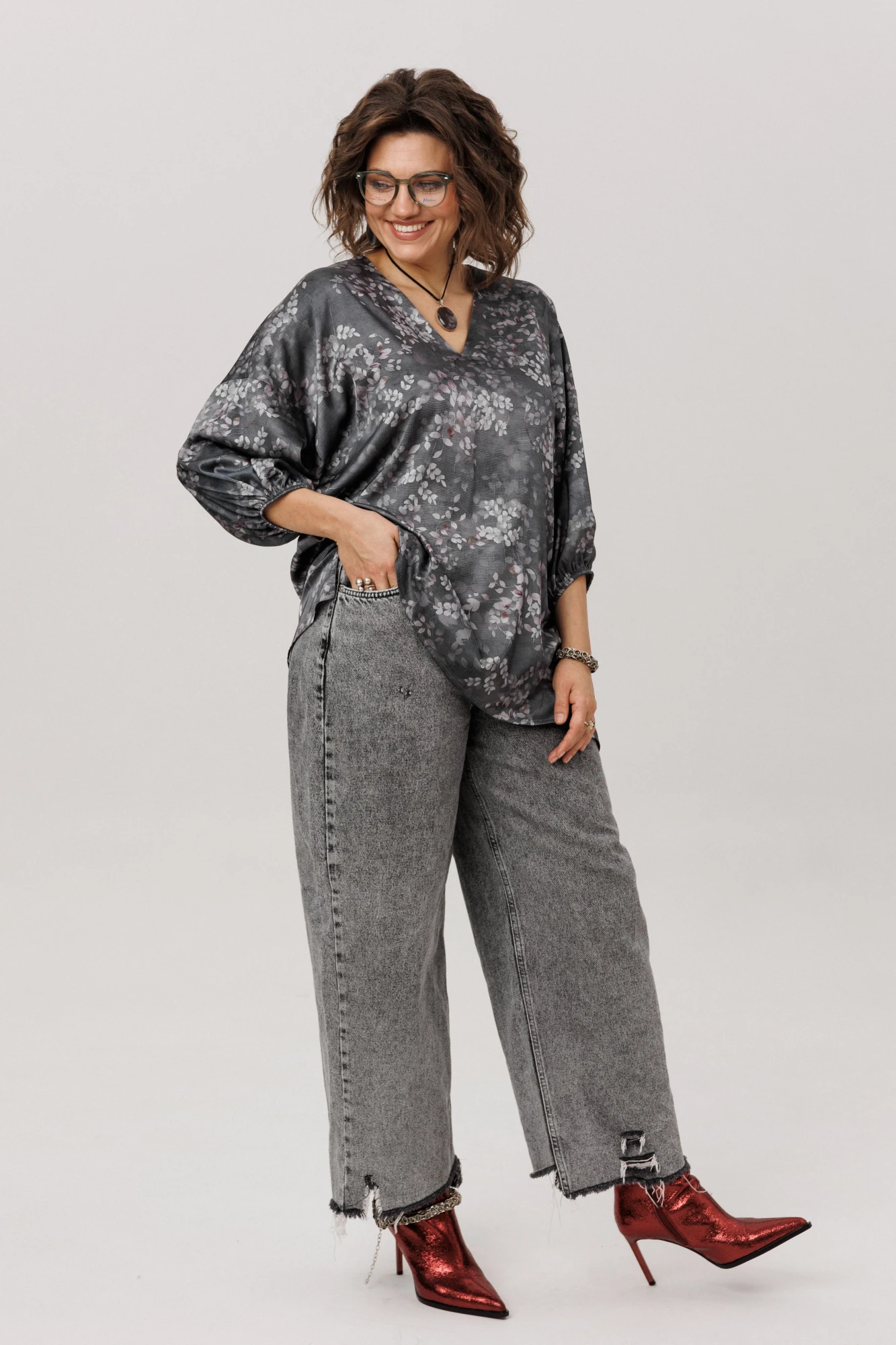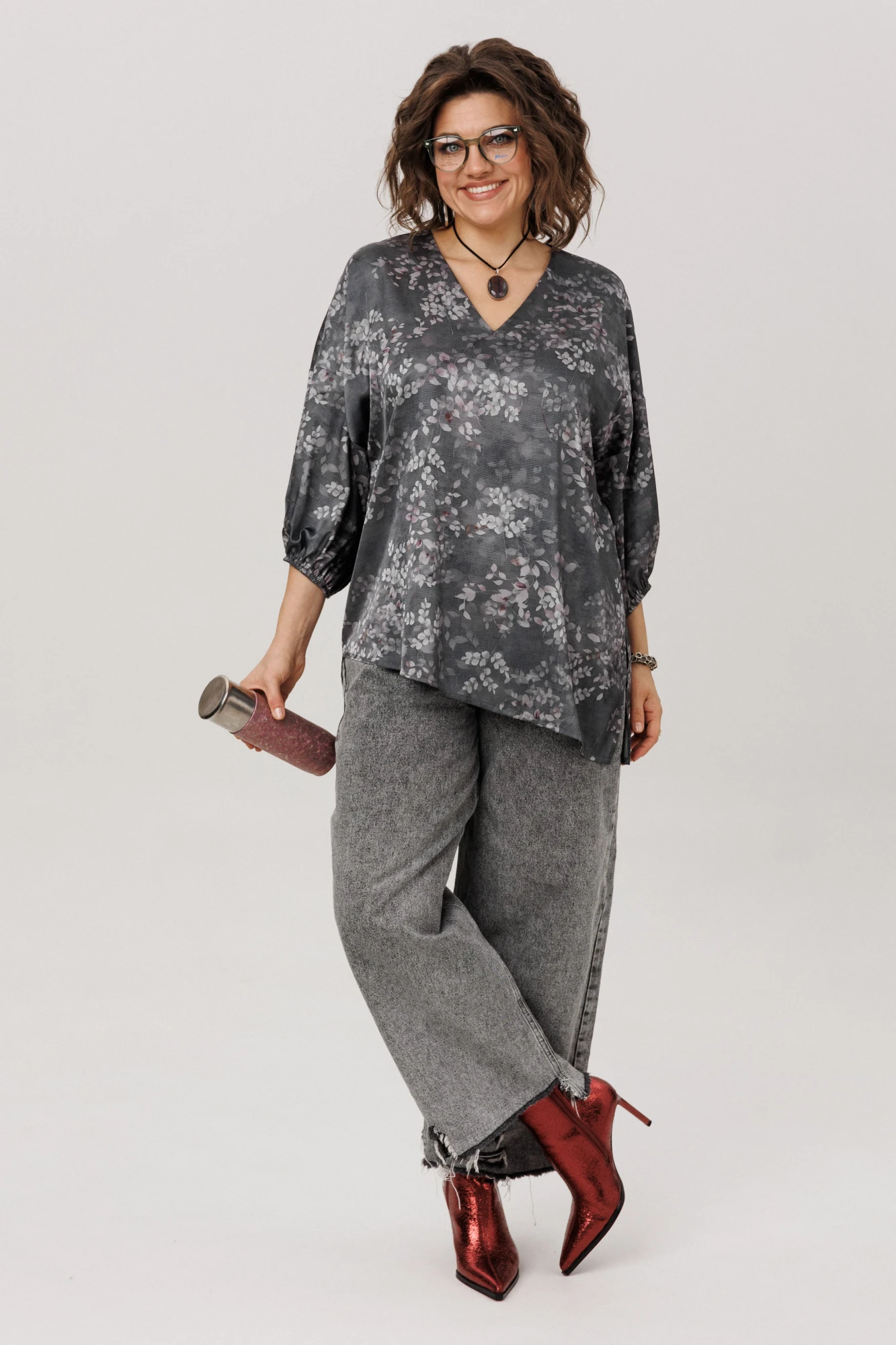 Главная особенность этой модели — продуманная многозадачность. Пояс в комплекте позволяет вам самостоятельно создавать нужный образ: затяните его, чтобы подчеркнуть талию и создать фигуру «песочные часы», или отпустите для расслабленного силуэта в стиле бохо. Завершает картину асимметричный низ с разрезом — деталь, которая делает блузу по-настоящему уникальной и визуально вытягивает силуэт.