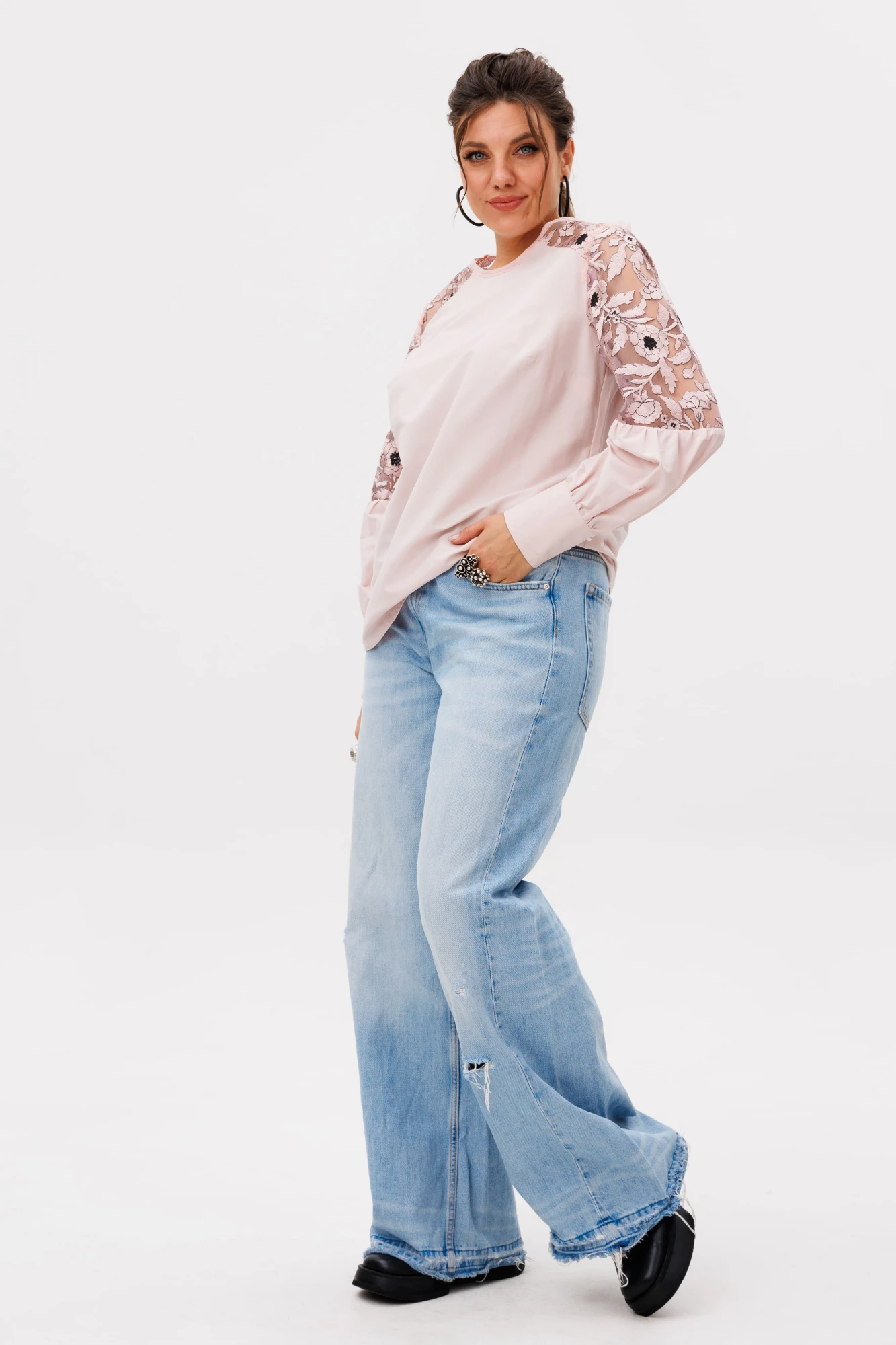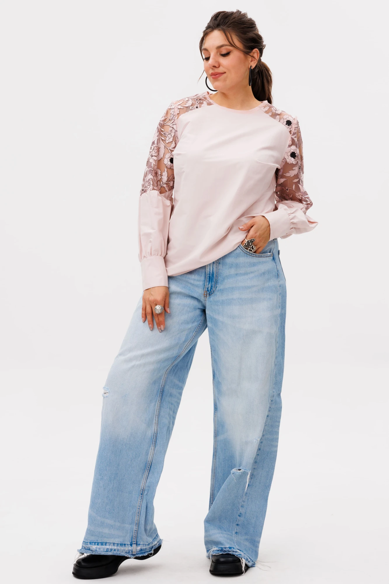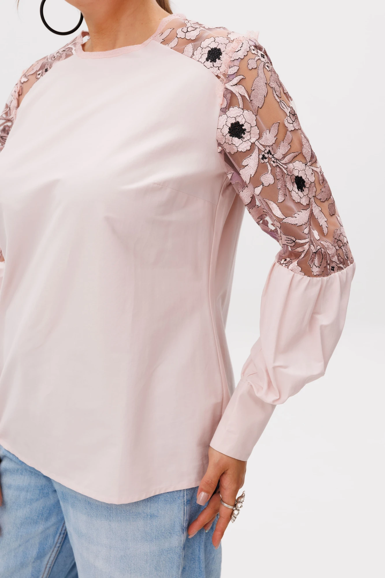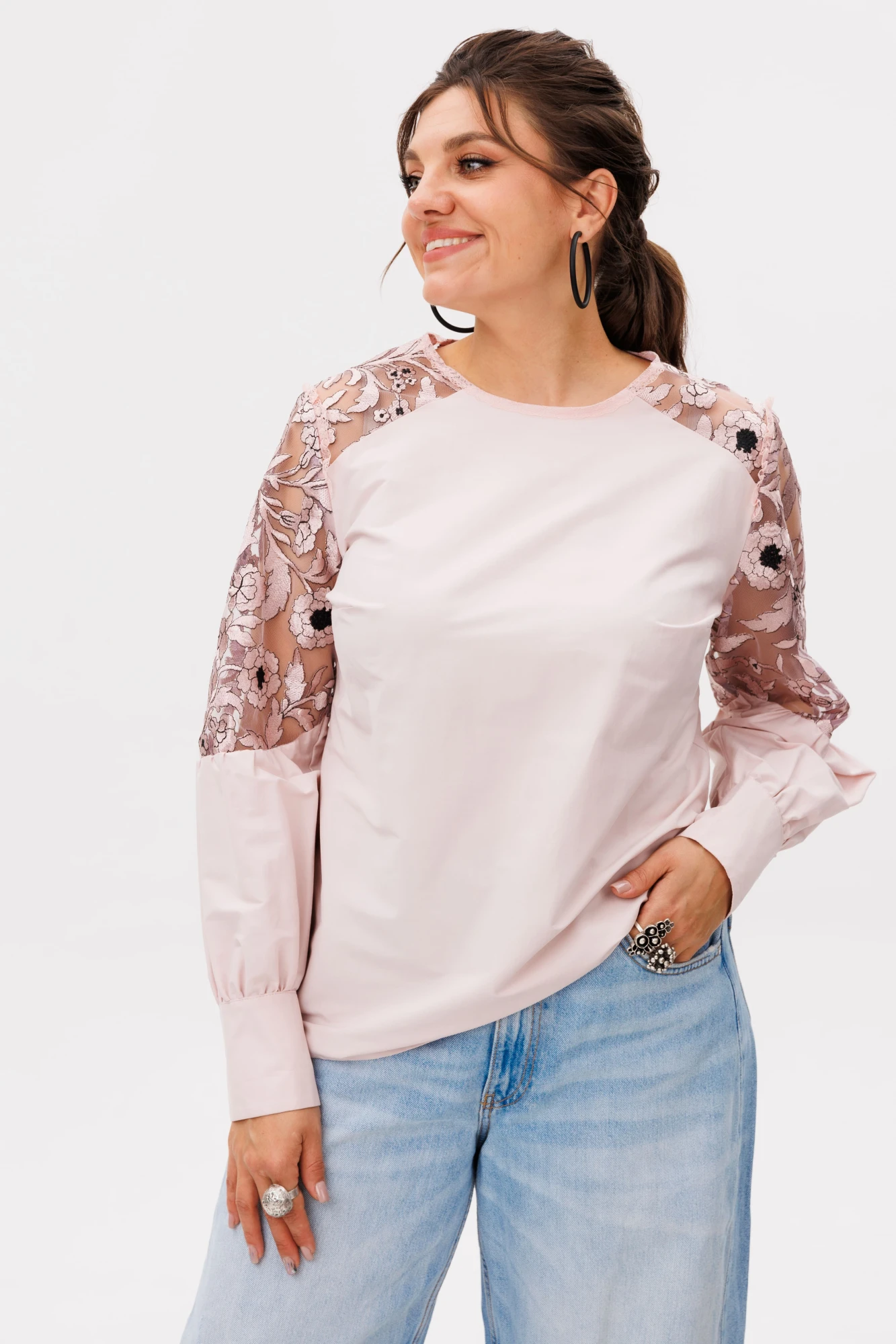 Мягкий округлый вырез горловины, обрамлённый нежной кружевной отделкой, подчёркивает женственность линий. Эта блуза в цвете «трепет роз» — это тихий диалог между скромностью и выразительной чувственностью.