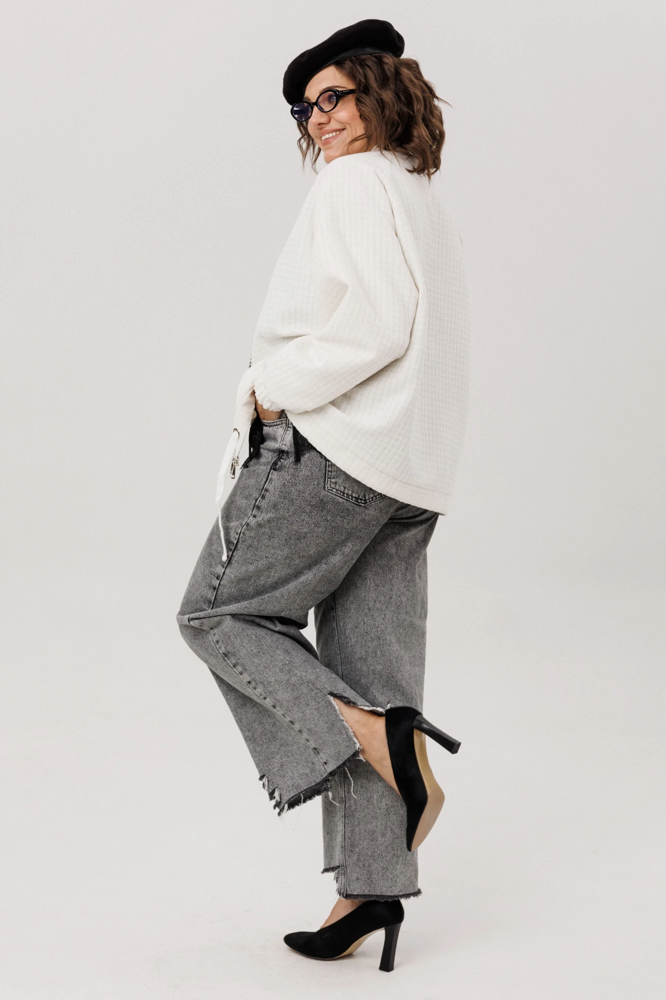 Рукава, плавно ниспадающие от линии плеча по крою реглан, завершаются мягкой резинкой, бережно собравшей ткань у запястья и подчеркивающей удобство фасона. Два накладных кармана, лаконично вписанные в композицию, хранят в себе тепло рук и необходимые мелочи. Особую харизму блузону придает продуманная кулиска по низу, позволяющая легко менять его характер — от слегка удлиненного и расслабленного до более собранного и короткого, адаптируя его под настроение и ситуацию.