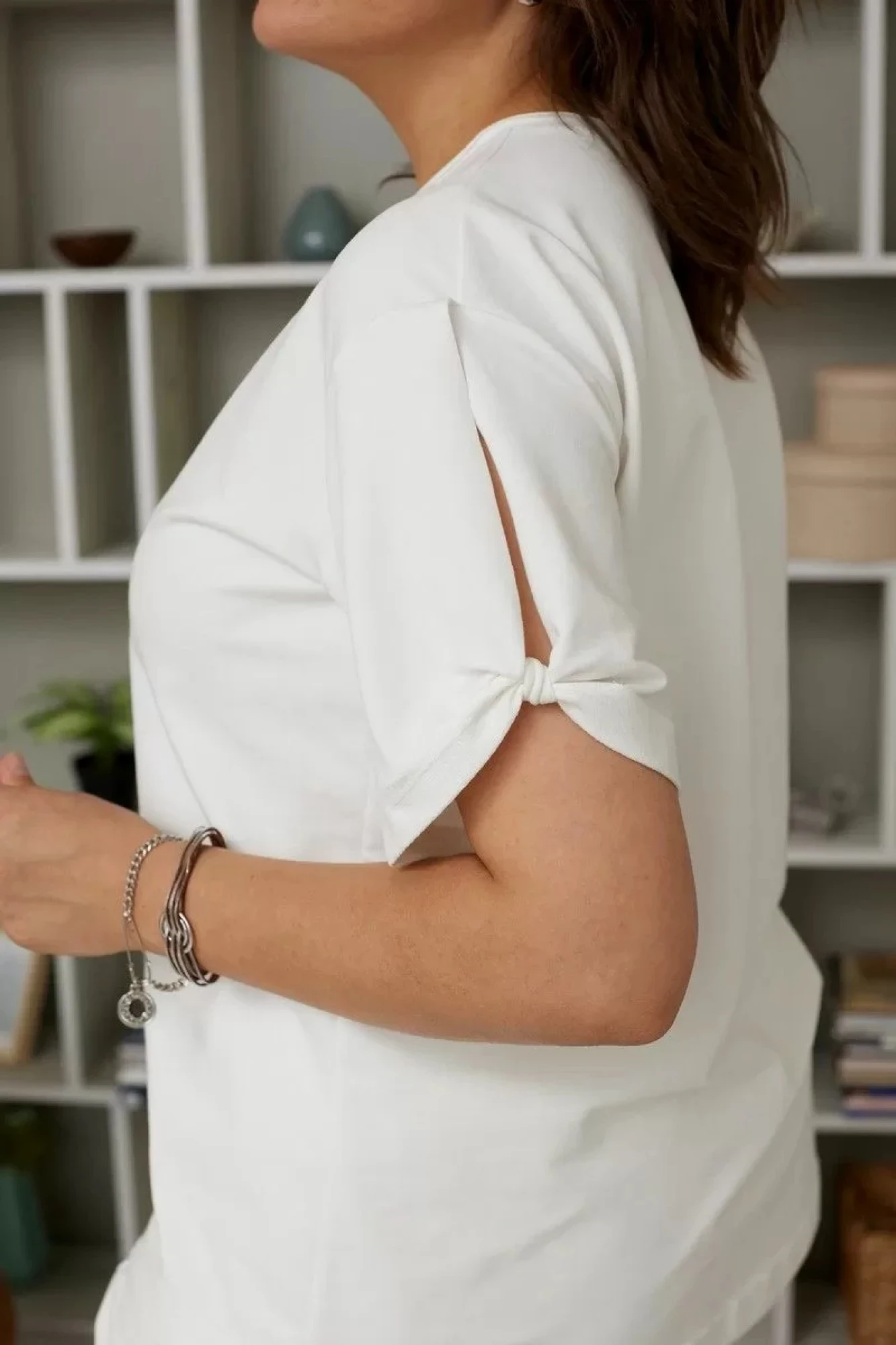 48,50, 52 , 54 ,56,58,60, 62Имеет округлый вырез горловины, декорированный термонаклейкой в виде булавки и обработанный притачной обтачкой с открытым срезом. Рукав имеет слегка спущенную линию проймы и декорирован разрезом с узлом. Низ изделия подшит на широкую подгибку изнаночной стороной вверх.