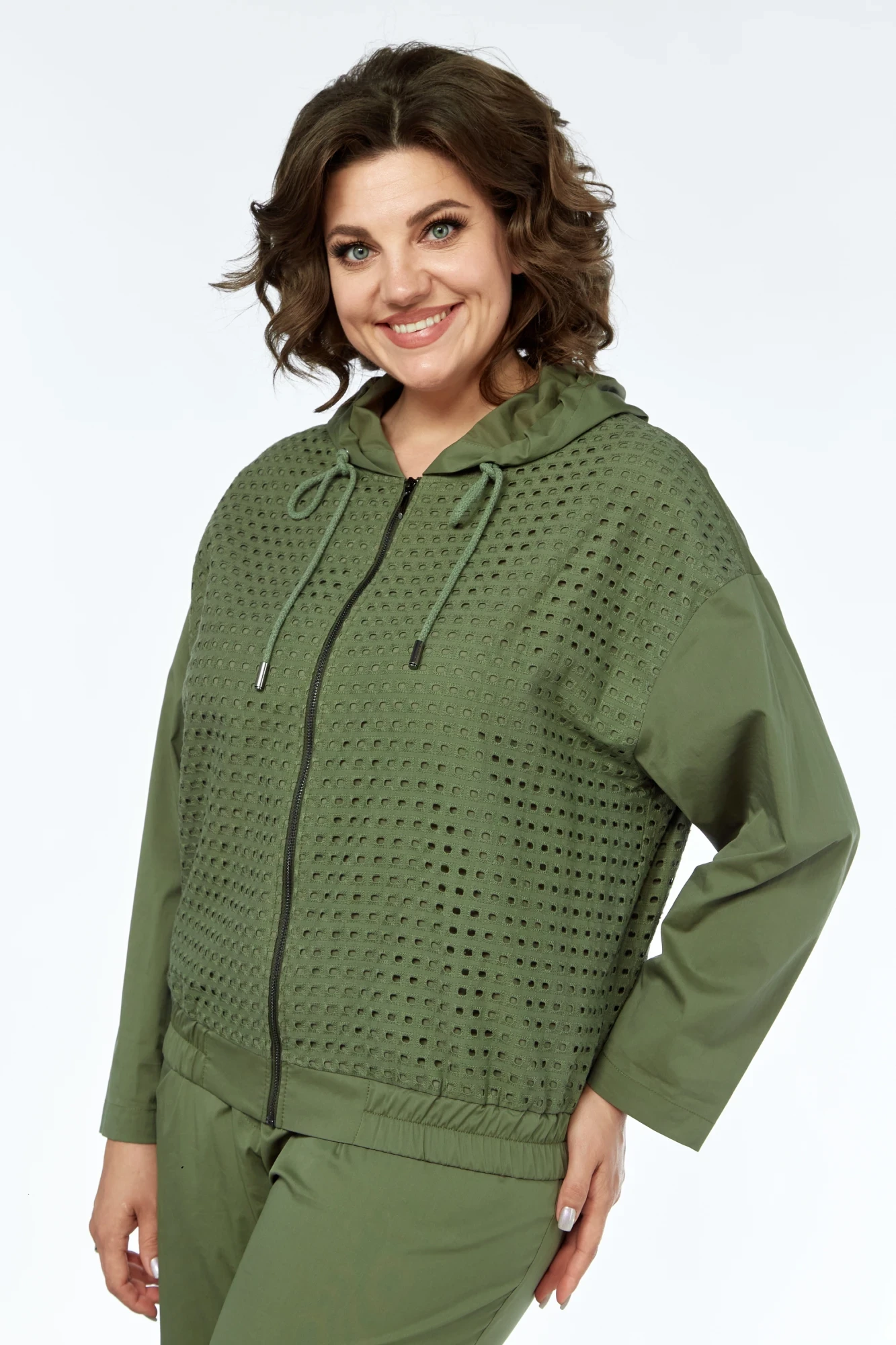 Комплект брючный состоит из брюк и блузона в виде бомбера. Брюки широкие с застежкой "молния" спереди, боковыми карманами и складками. Задние половинки с талиевыми вытачками. Пояс притачной, частично на резинке и со шлевками . Блузон с цельнокроенной застежкой "молния". Перед и спинка из отделочной ткани. Кокетка спинки, рукава и капюшон из основной ткани. Рукав втачной, одношовный со спущенной линией плеча. Воротник-капюшон с кулисой и шнурком. Блузон с поясом по низу, частично на резинке.