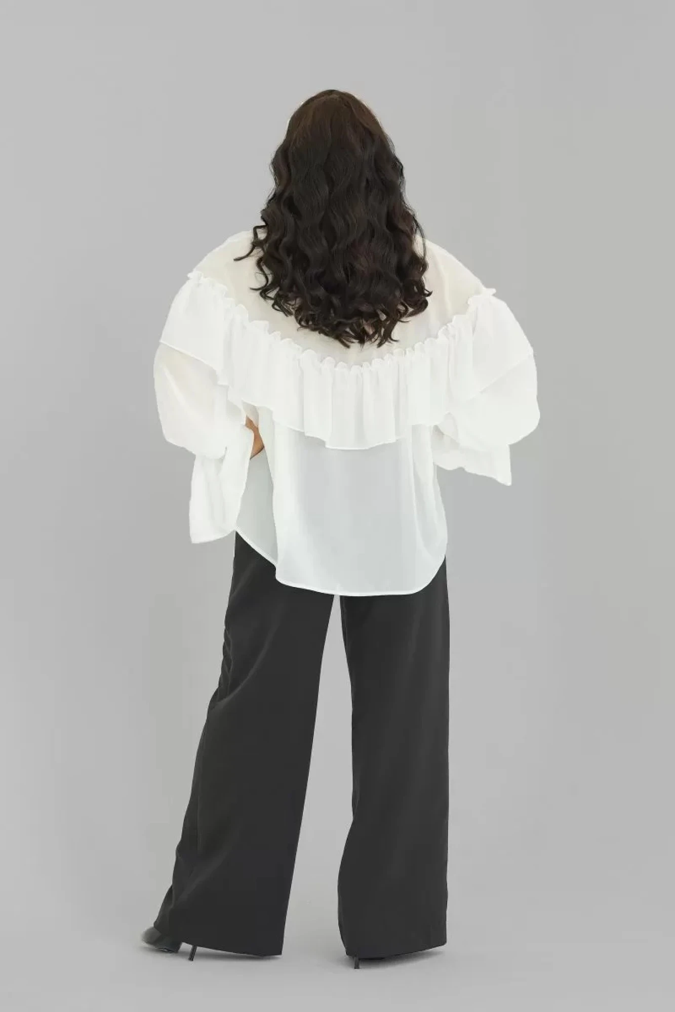 Стильная блуза свободного силуэта с воланами из шифона .