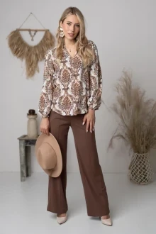 Кофточка очень симпатичная. Ткань тонкая, похожа на шелк (полиэстер). Идет в размер. Брала 54 разм. На мой рост 158 не длинная, хорошо и с брюками, и с юбкой.