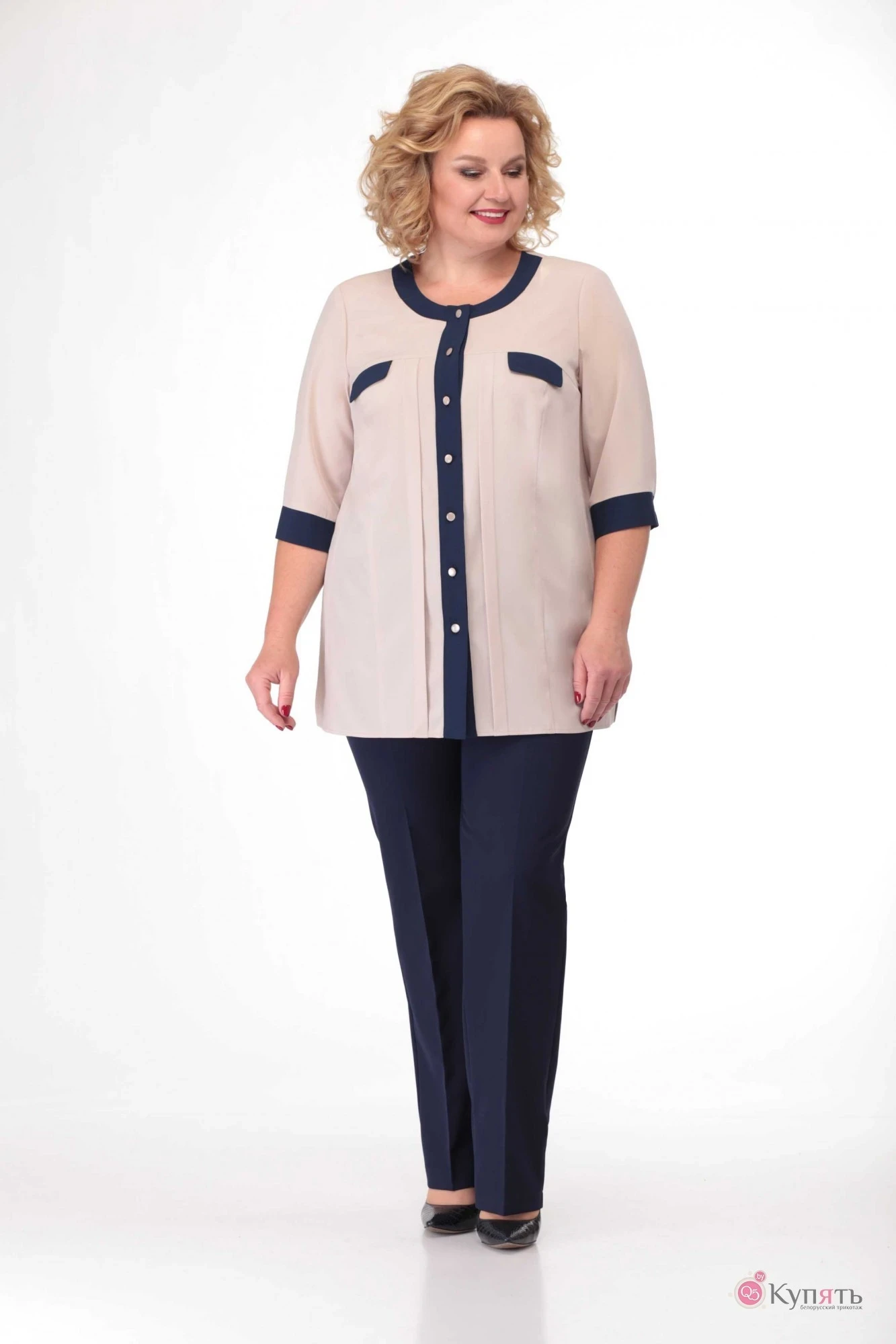 Блуза выполнена из блузочной ткани. Блуза имеет вырез округлой формы. В качестве отделочной ткани используется темно-синий материал, из которого выполнен обтачка горловины, клапан, манжет и планка. Блуза имеет застежку на пуговицы по всей длине. На передних полочках выполнены декоративные долевые складки. Низ блузы закругленный, спинка слегка удлиненная. По бокам имеются разрезы. Рукав с притачной манжетой на 2 пуговицы.