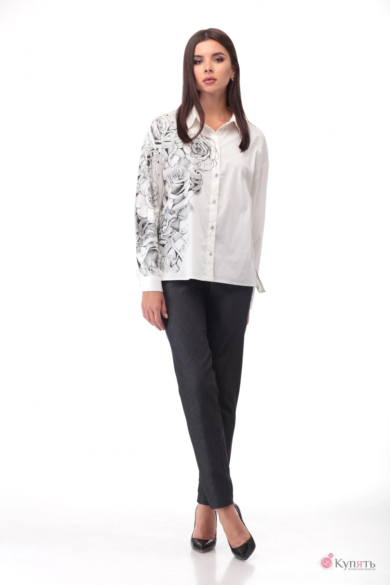 Элегантный женский блузон прямого силуэта, оверсайз. По переду смещенные рельефы, снизу с разрезами. Разрезы разноуровневче. По спинке блуза удлинена. Воротник рубашечный на отрезной стойке. Застежка однобортная по центру на петли и пуговицы. Рукав длинный со спущенной линией плеча, рубашечного типа. По низу притачная манжета с застежкой на петлю и пуговицу. Правая полочка и рукав задекорированы дизайнескимт печатным принтом. По спинке блузона-отрезная кокетка. От кокетки, по центру-две мягкие складки. Длина блузки по спинке-63,5 см.