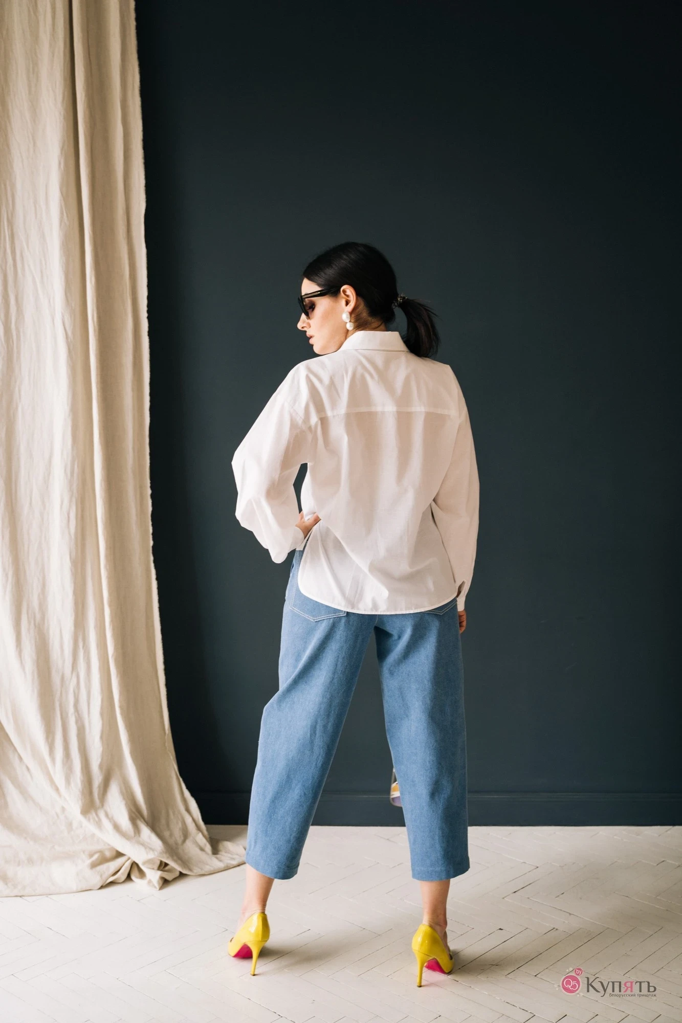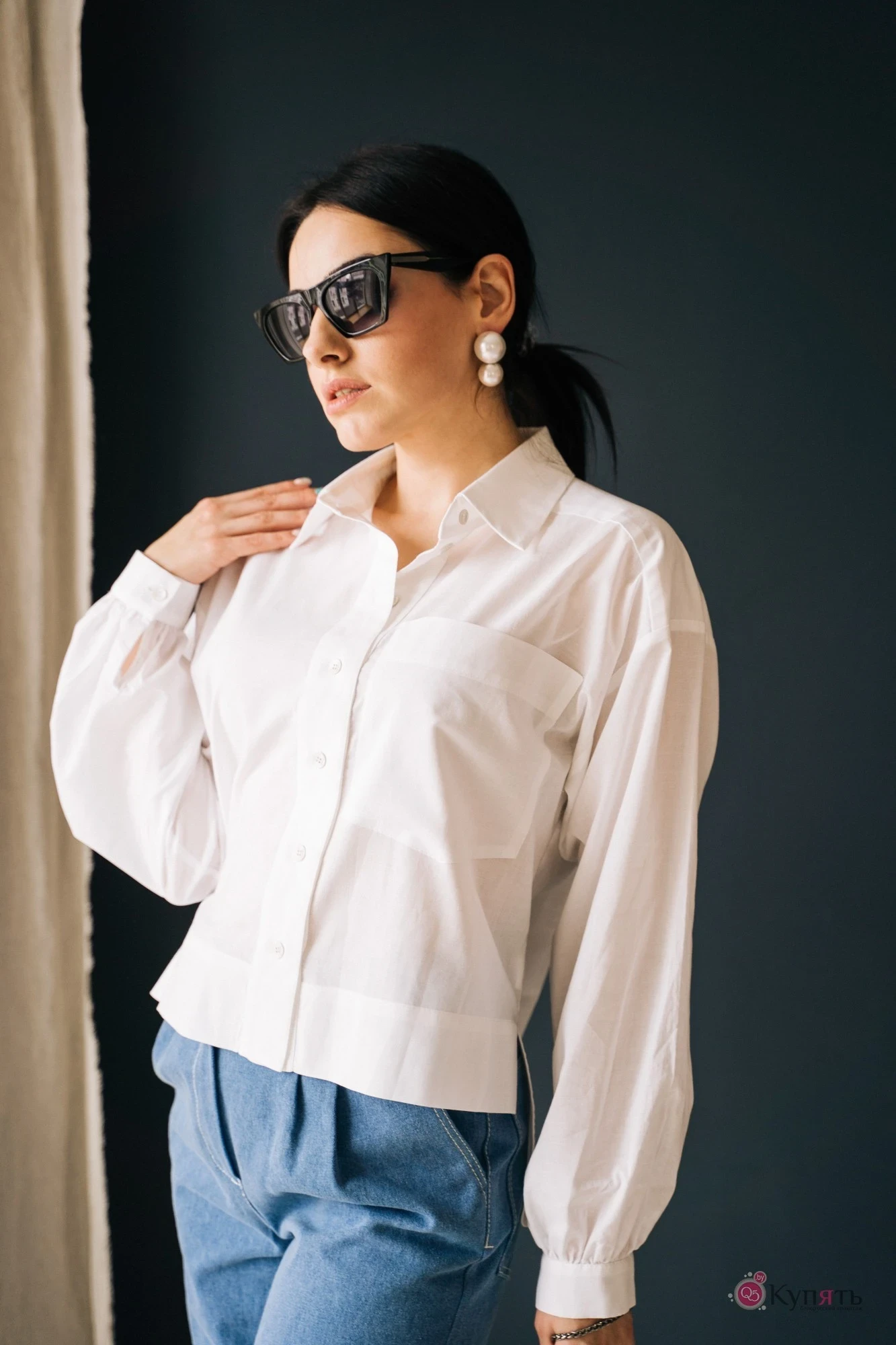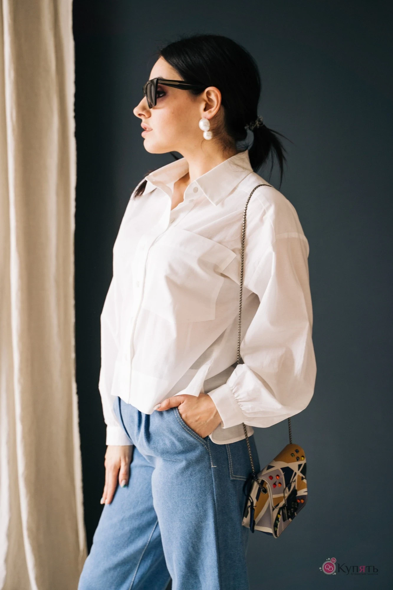 42,44,46Рубашка женская свободного кроя – оверсайз, из блузочной ткани. Застежка центральная, на петли и пуговицы. Воротник рубашечный, на отрезной стойке. На полочке нагрудный карман фигурной формы. Низ переда с широкой подгибкой низа. В боковых швах выполнены разрезы. Спинка с горизонтальной кокеткой и фигурным низом, более удлинённая относительно переда(на 10 см). Рукав рубашечный, снизу со сборкой на манжете, застёгивающейся на петлю-пуговицу.