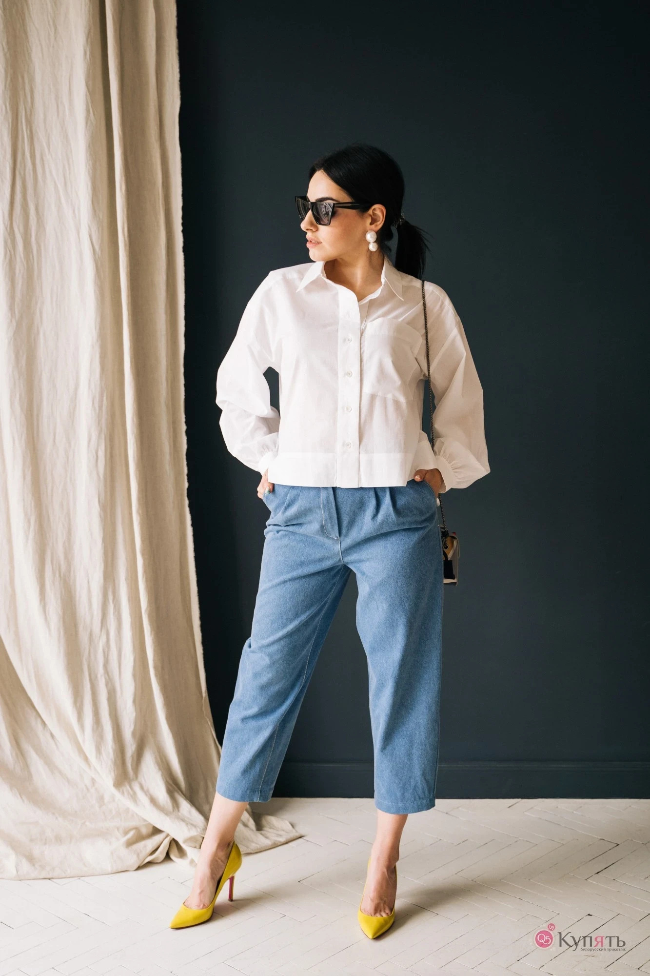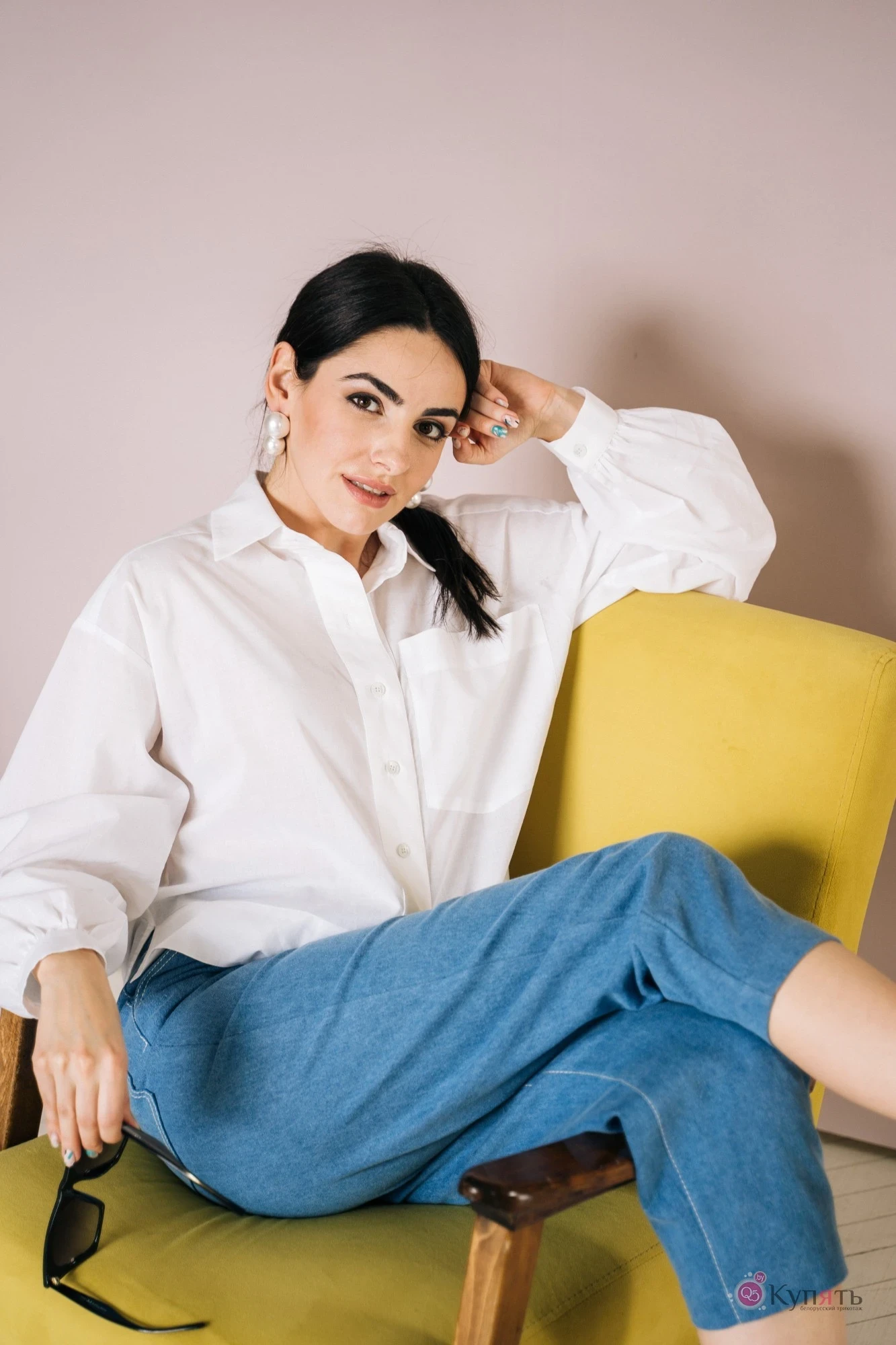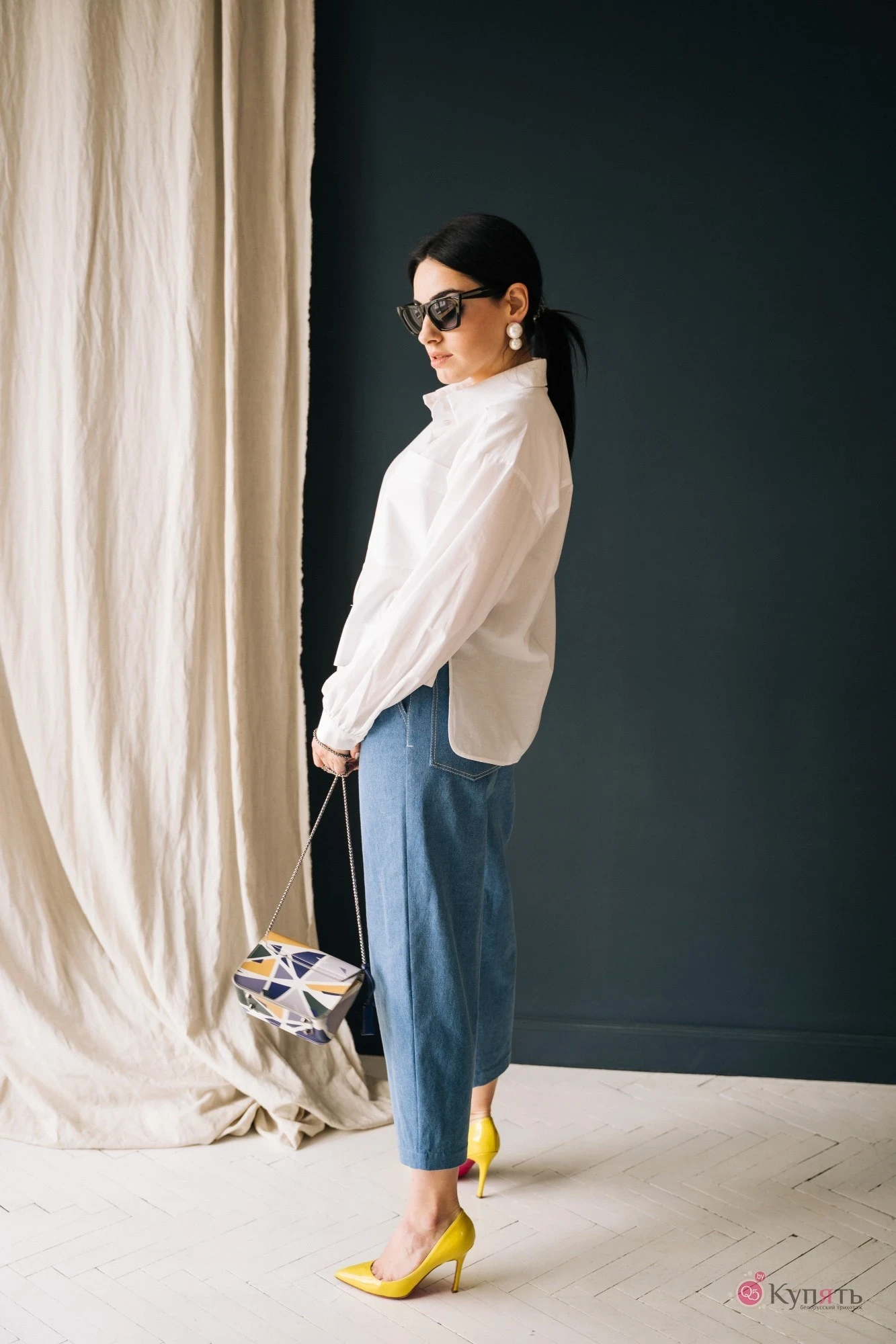 42,44,46Рубашка женская свободного кроя – оверсайз, из блузочной ткани. Застежка центральная, на петли и пуговицы. Воротник рубашечный, на отрезной стойке. На полочке нагрудный карман фигурной формы. Низ переда с широкой подгибкой низа. В боковых швах выполнены разрезы. Спинка с горизонтальной кокеткой и фигурным низом, более удлинённая относительно переда(на 10 см). Рукав рубашечный, снизу со сборкой на манжете, застёгивающейся на петлю-пуговицу.