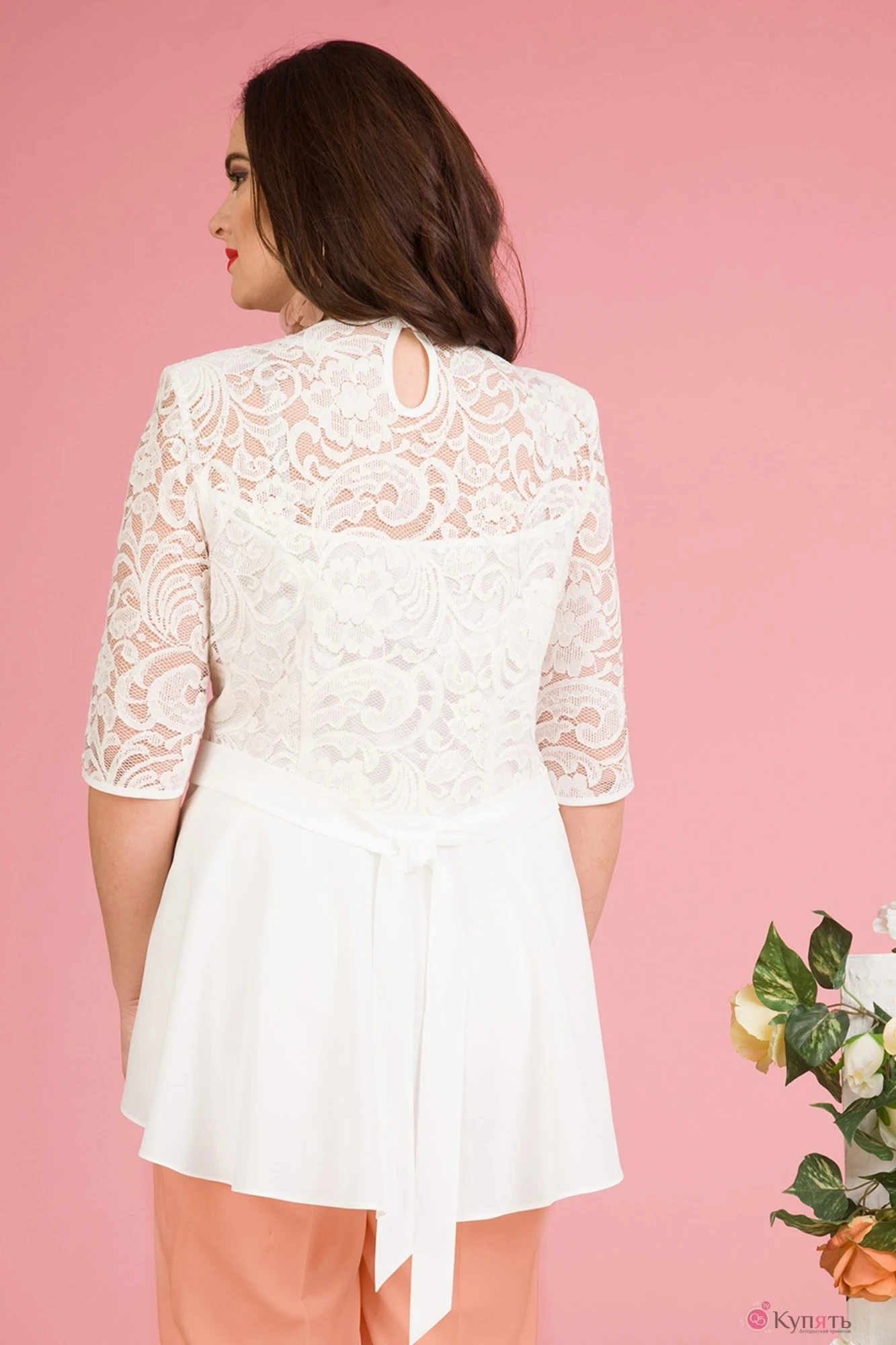 Элегантная нарядная туника-типа блузона, выполнена из легкого креп-шифона и набивного гипюра. Модель с округлым вырезом горловины, на планке. По полочке декоративные рельефы; бочки выполнены из однотонного креп-шифона, что зрительно делает фигуру более стройной. Полоска на стрейчевой подкладке телесного цвета. Спинка отрезная по талии, по низу приточена баска из шифона, расклешенная к низу. Спинка частично на подкладке телесного цвета; у горловины обработана застежка слезка на петлю и пуговицу. В боковых швах декоративный мягкий пояс, который может завязываться на бант. Рукав втачной, средней длинны. Модель украшает небольшой аксессуар в виде скрипичного ключа с бантиком (съемный). В этом наряде Вы подчеркнете свой изысканный стиль и элегантный образ.