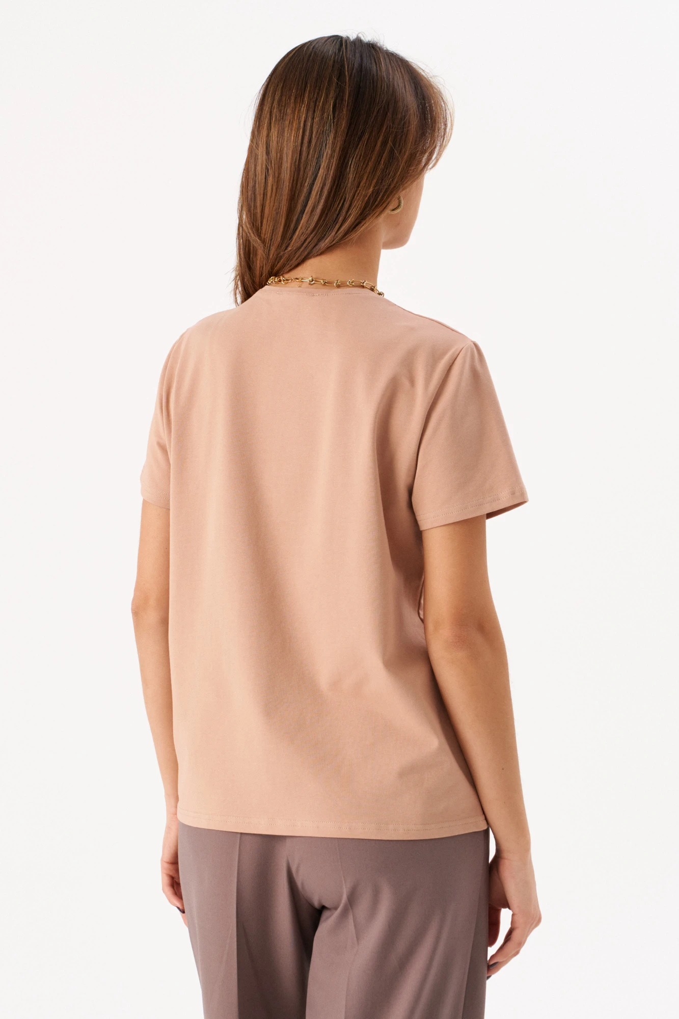 Классический крой с короткими рукавами и круглым вырезом, который подчеркивает изящность шеи.