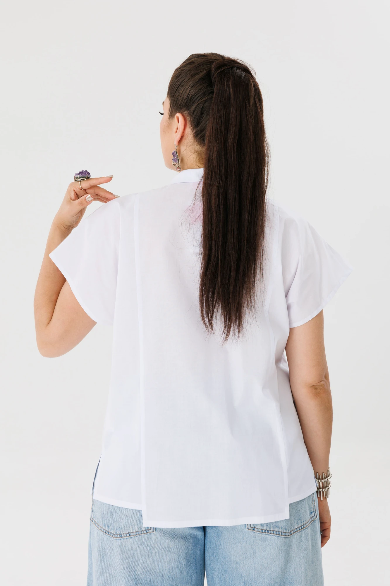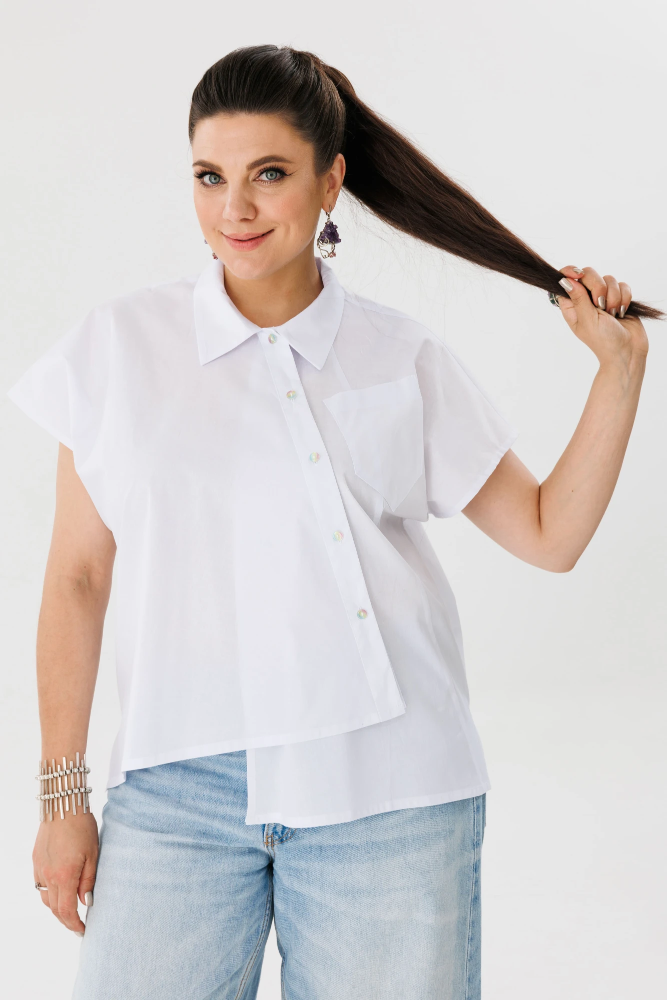 Необычная асимметрия кроя придает модели выразительность: одна сторона может быть слегка удлинена или оформлена мягкими складками, добавляя образу художественную свободу. Короткий цельнокроеный рукав сохраняет лаконичность и комфорт, гармонично сочетаясь с объемным силуэтом.