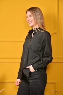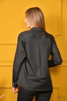 Важная особенность чёрной рубашки — её универсальность. Она уместна в деловом и повседневном стиле, с её помощью легко создать интересный гранж или рокерский образ. Она также сочетается с джинсами и классическими костюмами, как и белая. Строгость и элегантность черной рубашке добавляет отложной воротник с отрезной стойкой и застежкой-планкой на петли и пуговицы. Планка оформлена декоративной лентой. Полочки с нагрудными выточками. Полочку дополняет накладной карман. Рукав втачной длинный, низ рукава оформлен притачной манжетой на две пуговицы. Замеры: Рост фотомодели 166 см. Размер у фотомодели – 42. Блуза такой же модели в белом цвете СО 01-2.