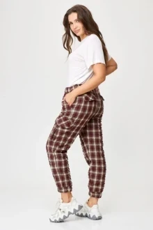 Брюки-карго представлены в двух тонах – бордо и графит. Принт – клетка.