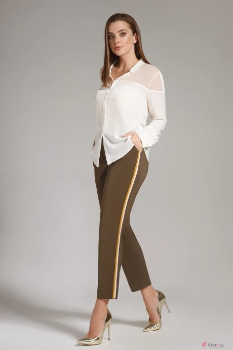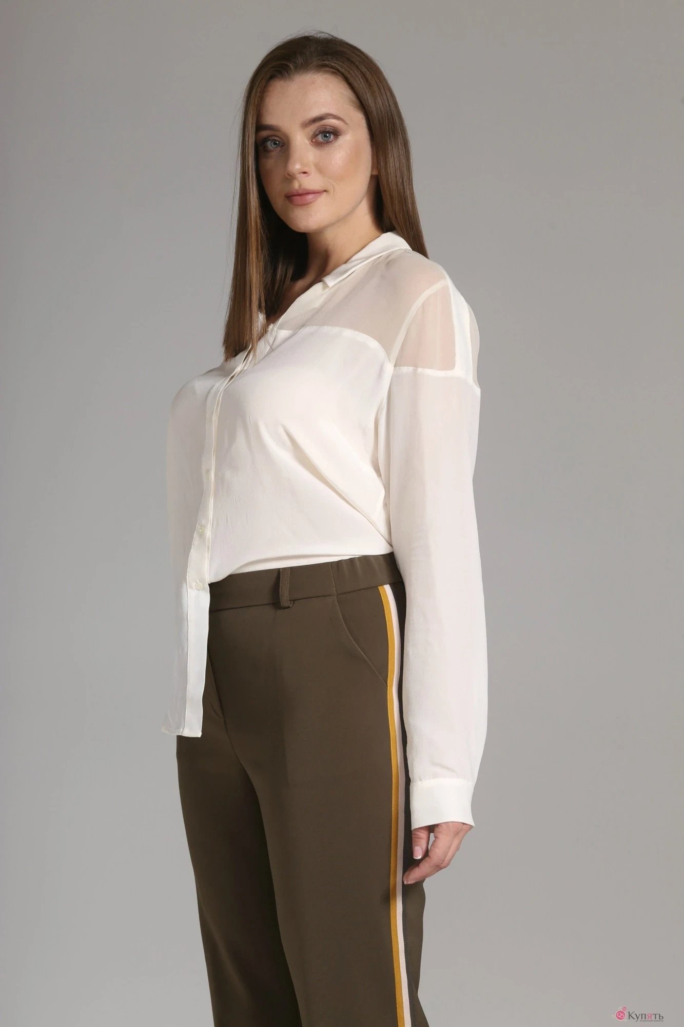 Брюки с высокой посадкой из текстильного полотна с боковыми карманами, лампасами, разрезами 5 см. по низу в шаговых швах и застежкой на молнию и пуговицу.
