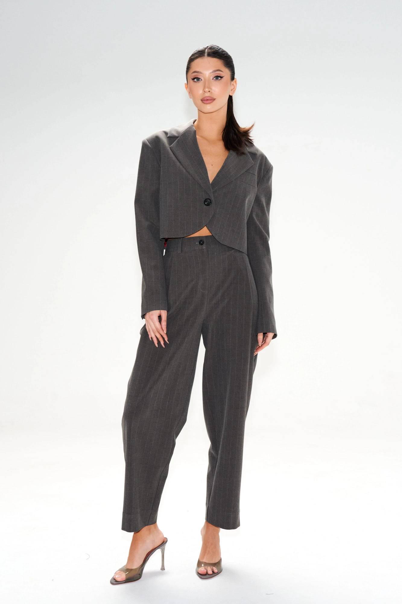 Брюки прямого свободного кроя выполнены из полотна темно-коричневого цвета в тонкую полоску. Характеристики: прямой крой, стабильный пояс, в боковых швах караманы, складки по переду изделия. Длина по боковому шву 104 см