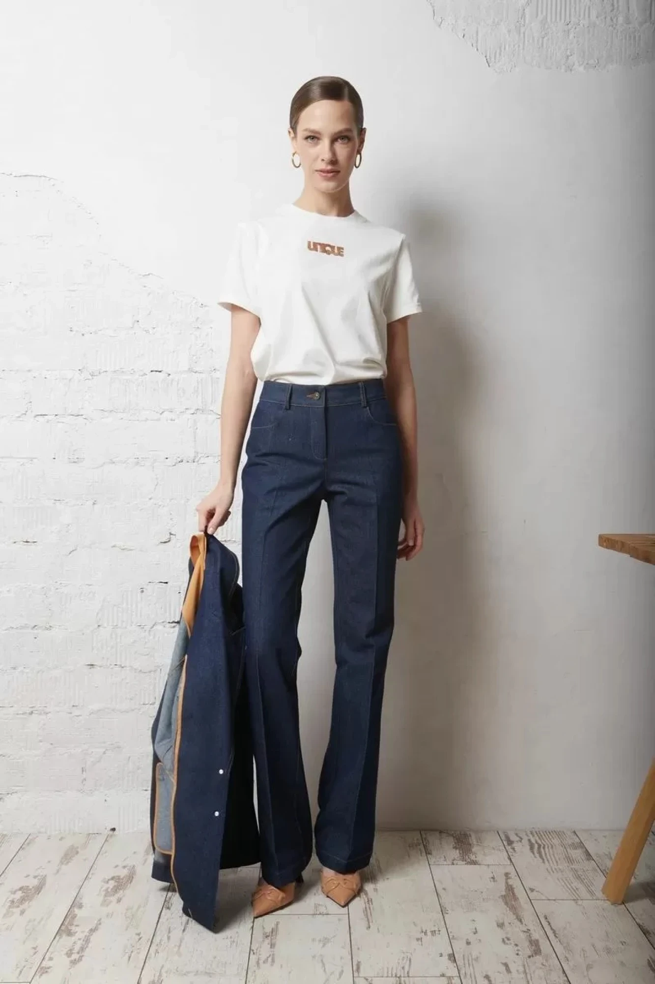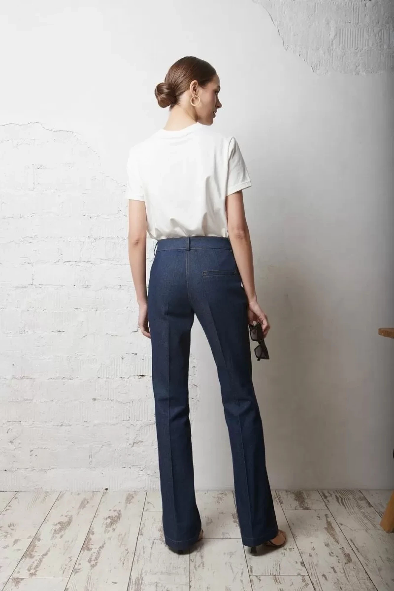 Брюки из джинсовой ткани с посадкой на талии, полуприлегающие до линии колена и слегка расширены к низу, брюки длиной до щиколотки. Передние половинки со скруглёнными карманами-хулиганами. В среднем шве застёжка на тесьму-молнию. Задние половинки с талиевыми вытачками, с нефункциональным карманом с листочкой, справа. Пояс притачной с застёжкой на петлю и пуговицу, с пятью шлёвками для съёмного пояса. Низ застрочен широкой отделочной строчкой. По центру деталей переда и спинки заутюжены стрелки. По швам входа в карман, вокруг листочек, по поясу, среднему шву, гульфику, прострочены отделочные строчки, по боковым швам прострочены двойные отделочные строчки. По концам листочки, и в нижней точке передних карманов, возле боковых швов, установлены хальнитены.