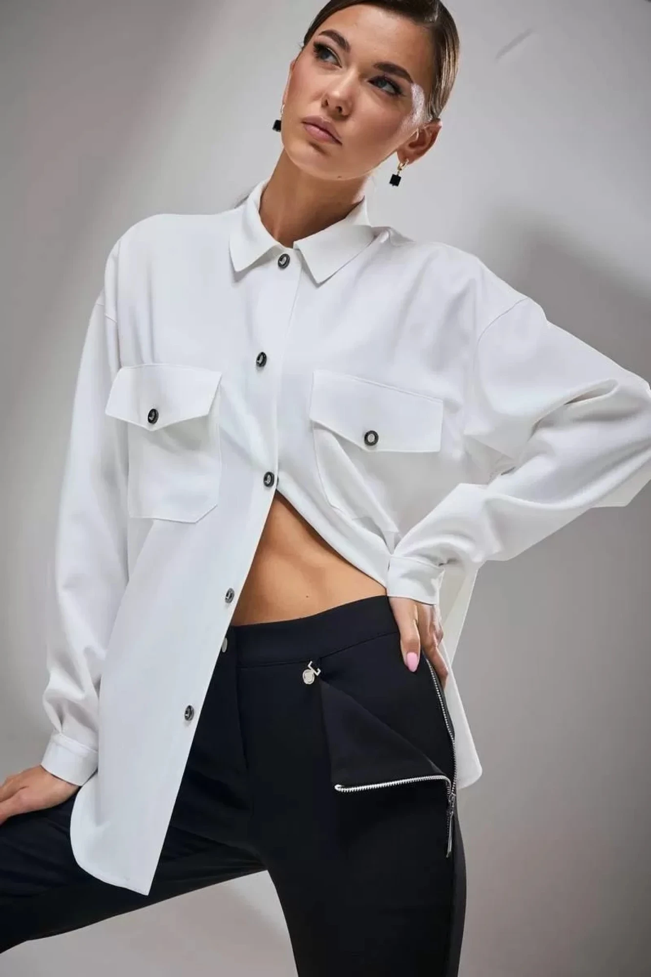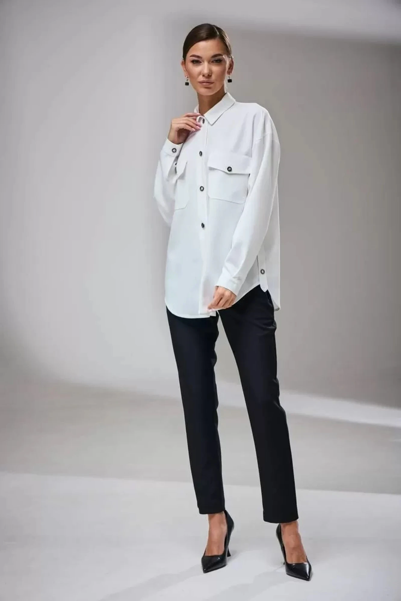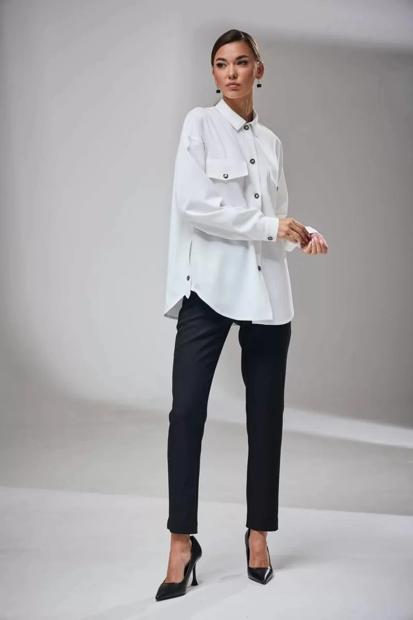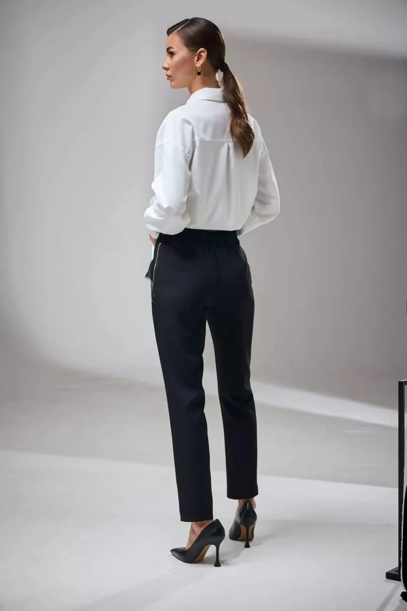 Брюки женские, прямые. По переду обработана застежка на молнию, справа карман с наклонным входом, слева карман на молнии с отворотом и металлическим украшением. Сзади вытачки. Верх брюк обработан притачным поясом (частично на резинке) с застежкой на кнопку. Декоративные элементы и фурнитура могут отличаться от заявленных на фото.