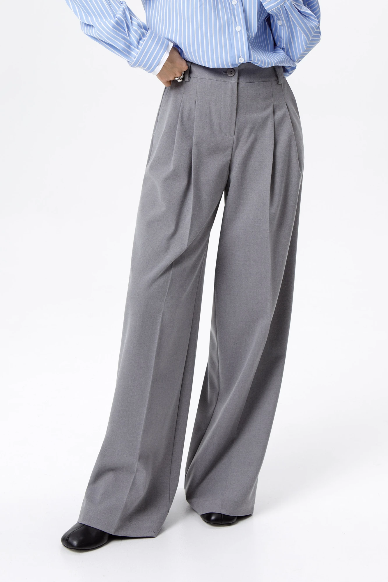 Детали: широкие брюки-палаццо с небольшими складками у пояса и заутюженными стрелками, притачной пояс со шлевками, застежка на молнию и пуговицу, боковые карманы. Задние части брюк с вытачками и имитацией карманов.