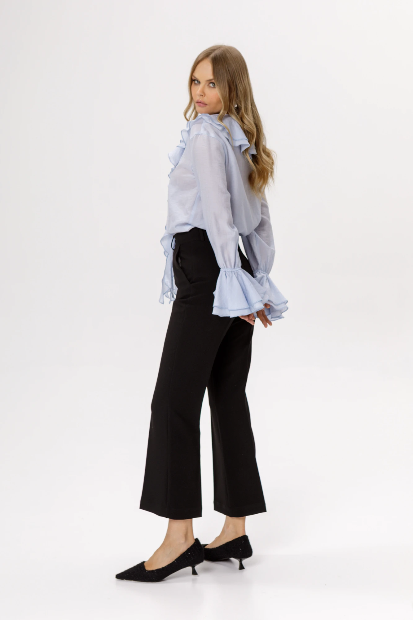Детали: брюки клёш с притачным поясом со шлёвками, наклонные карманы в боковых швах, застёжка на молнию и крючок, талиевые вытачки на передних и задних половинках брюк.