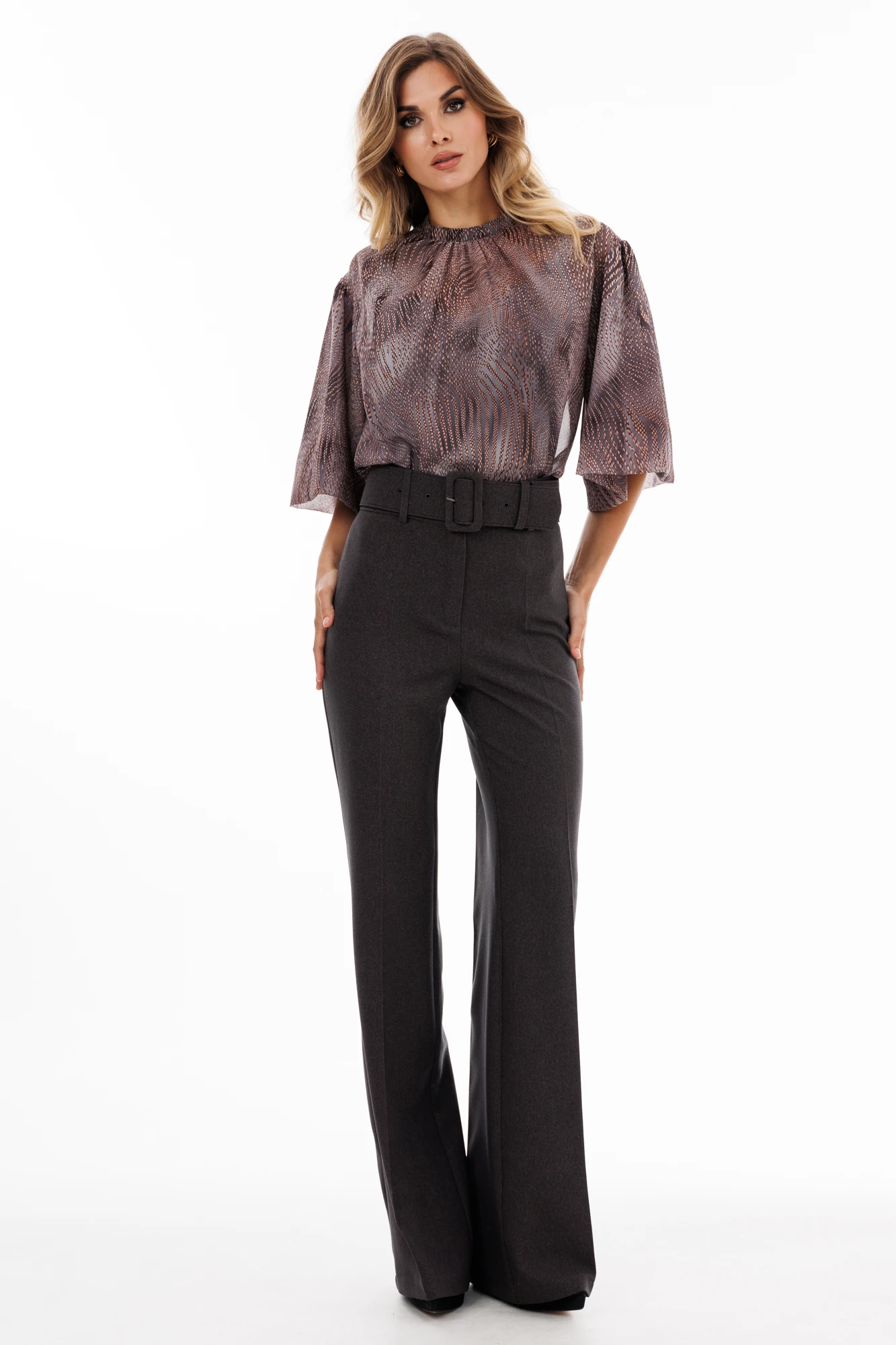 Брюки выполнены из костюмной ткани. Брюки покроя ""клеш"", на притачном поясе, длиной в пол. Спереди застежка на молнию с гульфиком, потайную пуговицу и два брючных крючка. Передние и задние части брюк заутюжены на кант. В комплект входит съемный пояс из основной ткани.