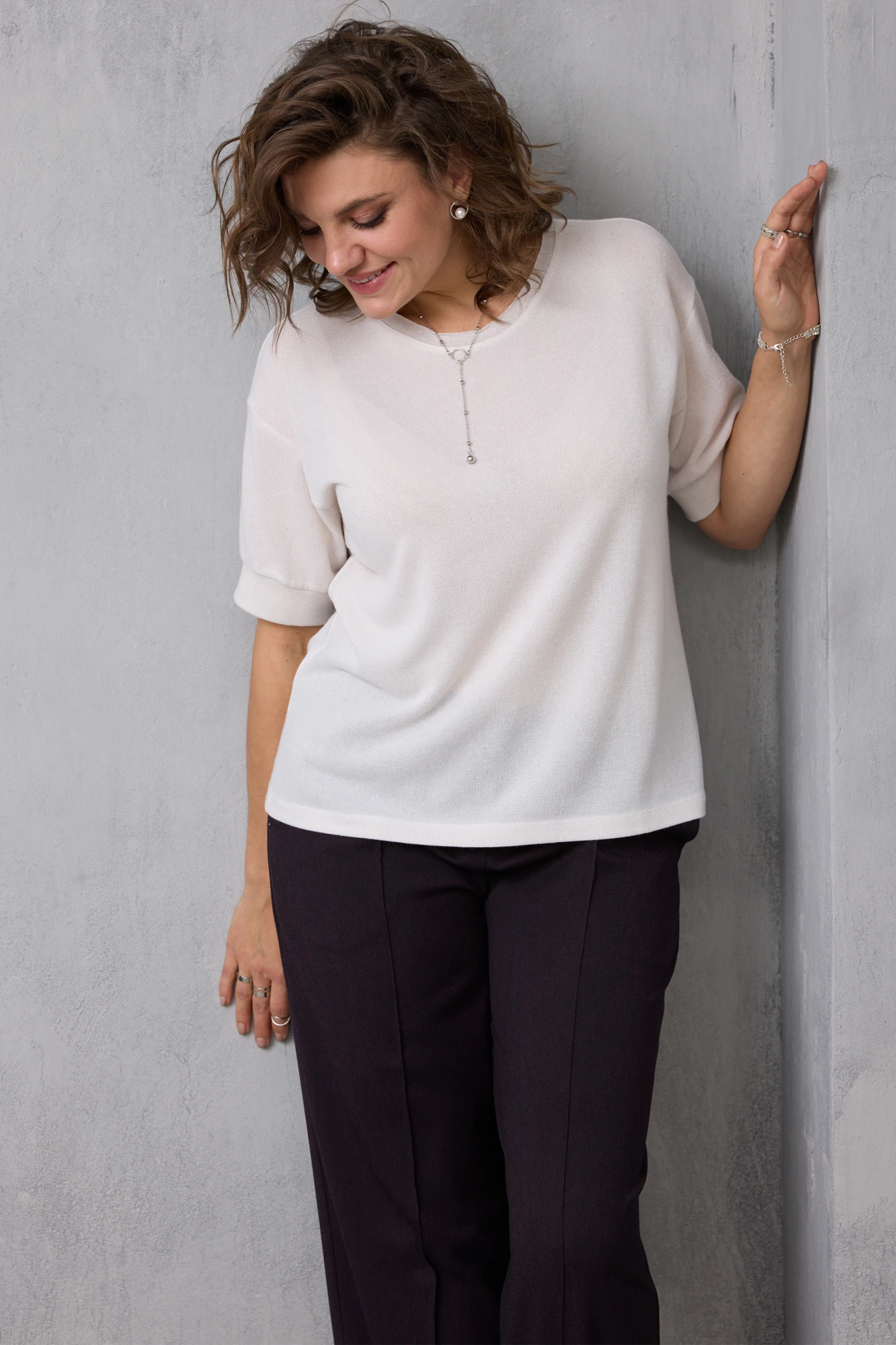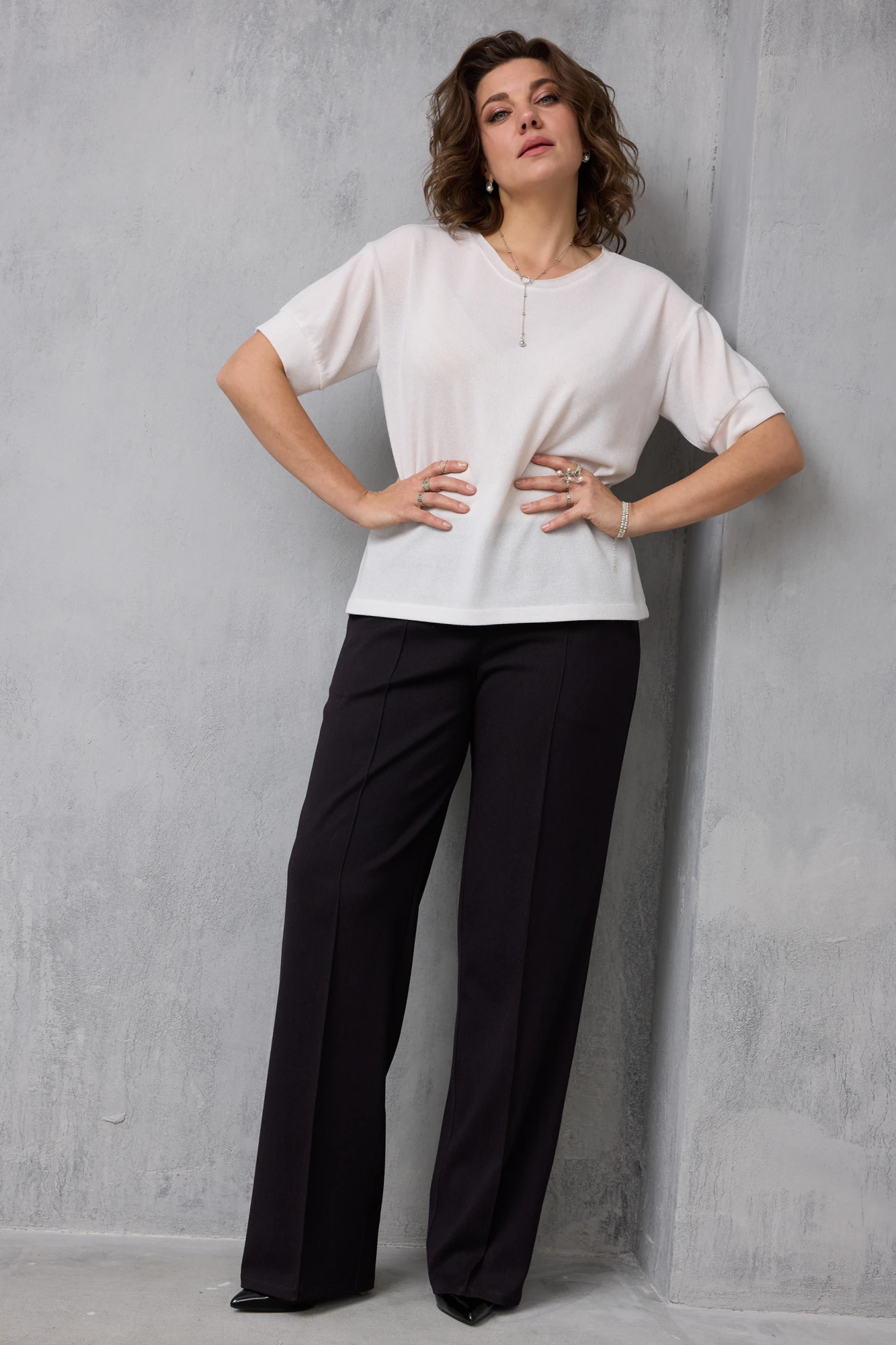 Блуза полуприлегающего кроя с горловиной полукруглой формы, обработанной обтачкой с открытым срезом. Линия плеча слегка спущена. Рукав короткий, втачной, на манжете из основного материала. Низ изделия обработан декоративной плоскошовной строчкой.