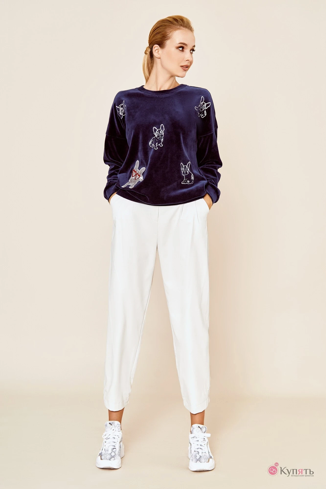 Джемпер полуприлегающего силуэта со спущенной линией плеча и округлой горловиной. По передней полочке декорирован авторской вышивкой-аппликацией.
