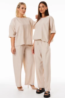 Изготовлен из жатой вискозной ткани, которая отличается мягкостью, воздухопроницаемостью и приятной текстурой. Материал не только обеспечивает комфорт в течение всего дня, но и сохраняет форму даже после активной носки. Мягкие складки ткани добавляют образу динамики, а нейтральная палитра оттенков позволяет легко интегрировать джемпер в любую капсульную коллекцию.
