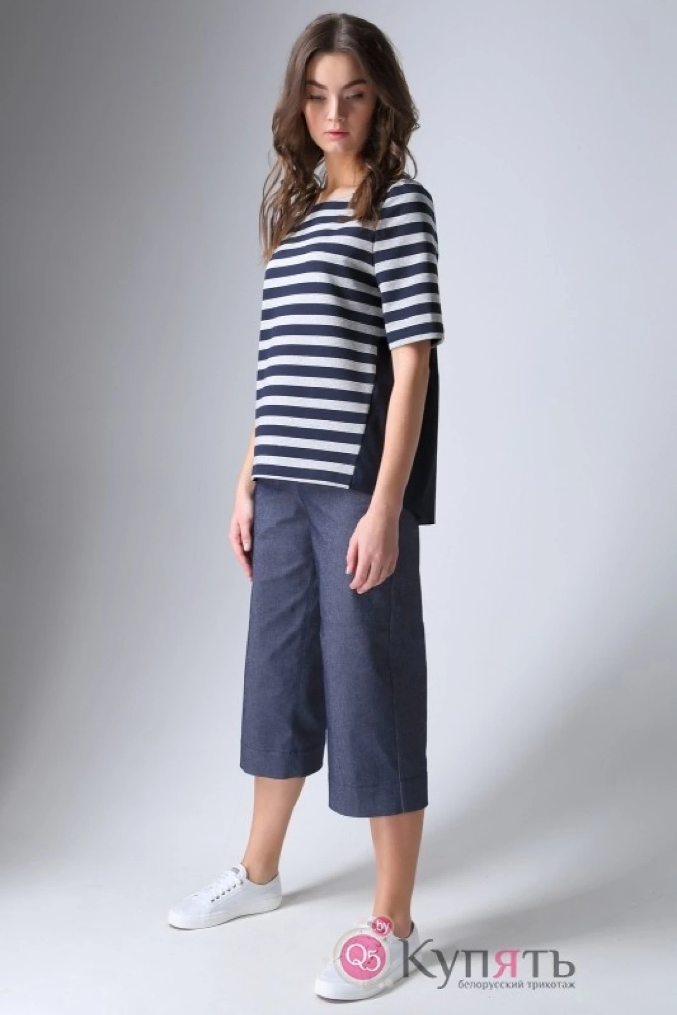 Стильный джемпер из хлопкового трикотажного полотна в полоску свободного силуэта, нижняя делать спинки выполнена из хлопковой блузочной ткани со сборкой.