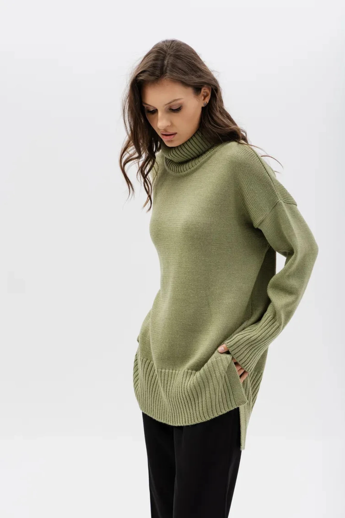 Дизайн: высокий воротник-гольф и объёмные рукава придают свитеру современный и модный вид;