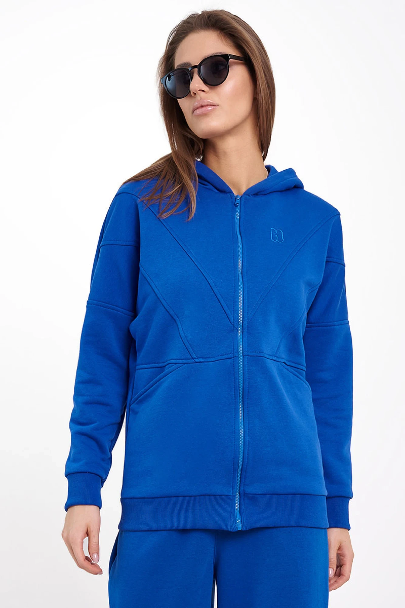 Стильный женский джемпер свободного кроя. Манжеты рукавов и планка по низу изделия выполнены из ткани-компаньона кашкорсе в цвет основной ткани. Джемпер с цельнокроенным рукавом и двойным капюшоном. Застежка - молния по центру. На переде выполнены модельные треугольные резы. Удобные карманы в нижней части полочки, вышивка - логотип на левом стороне в цвет ткани.
