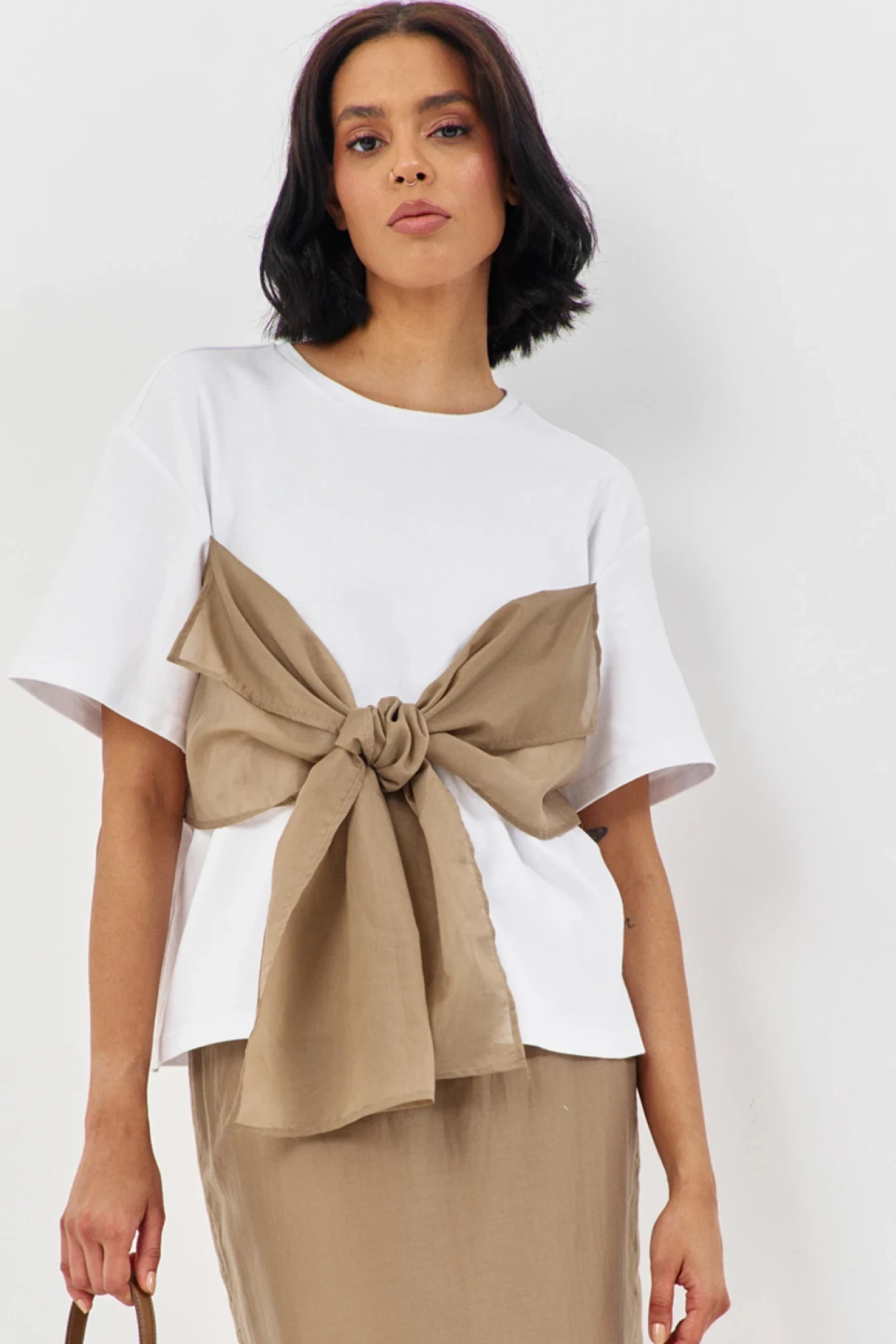 Майка свободного силуэта со спущенным рукавом. Характеристики: выполнена из трикотажного полотна в белом цвете, по переду декоративный бант в цвете капучино, горловина обработана планкой, рукав укороченный. Длина майки по переду 61 см, длина рукава 21 см.