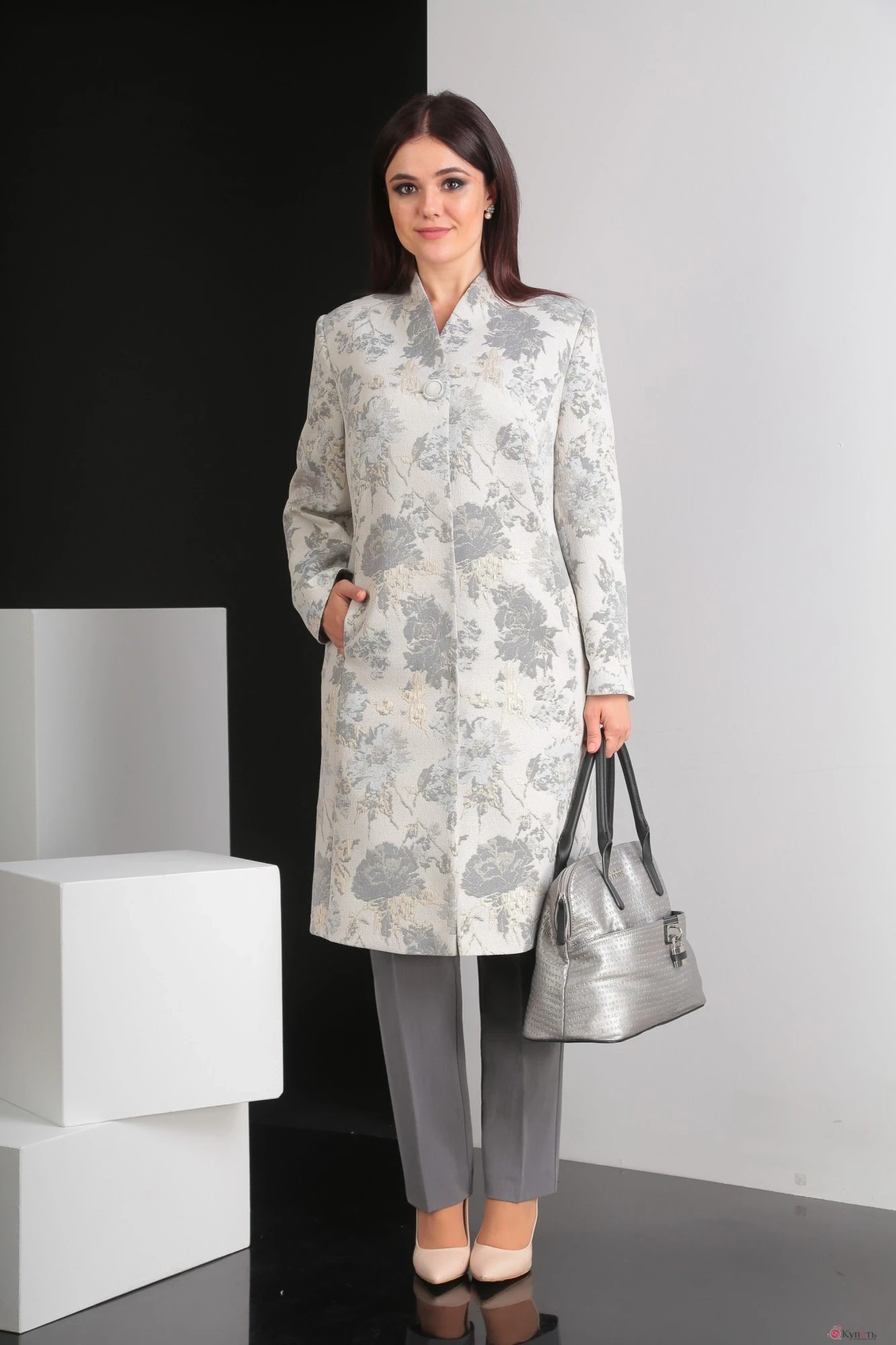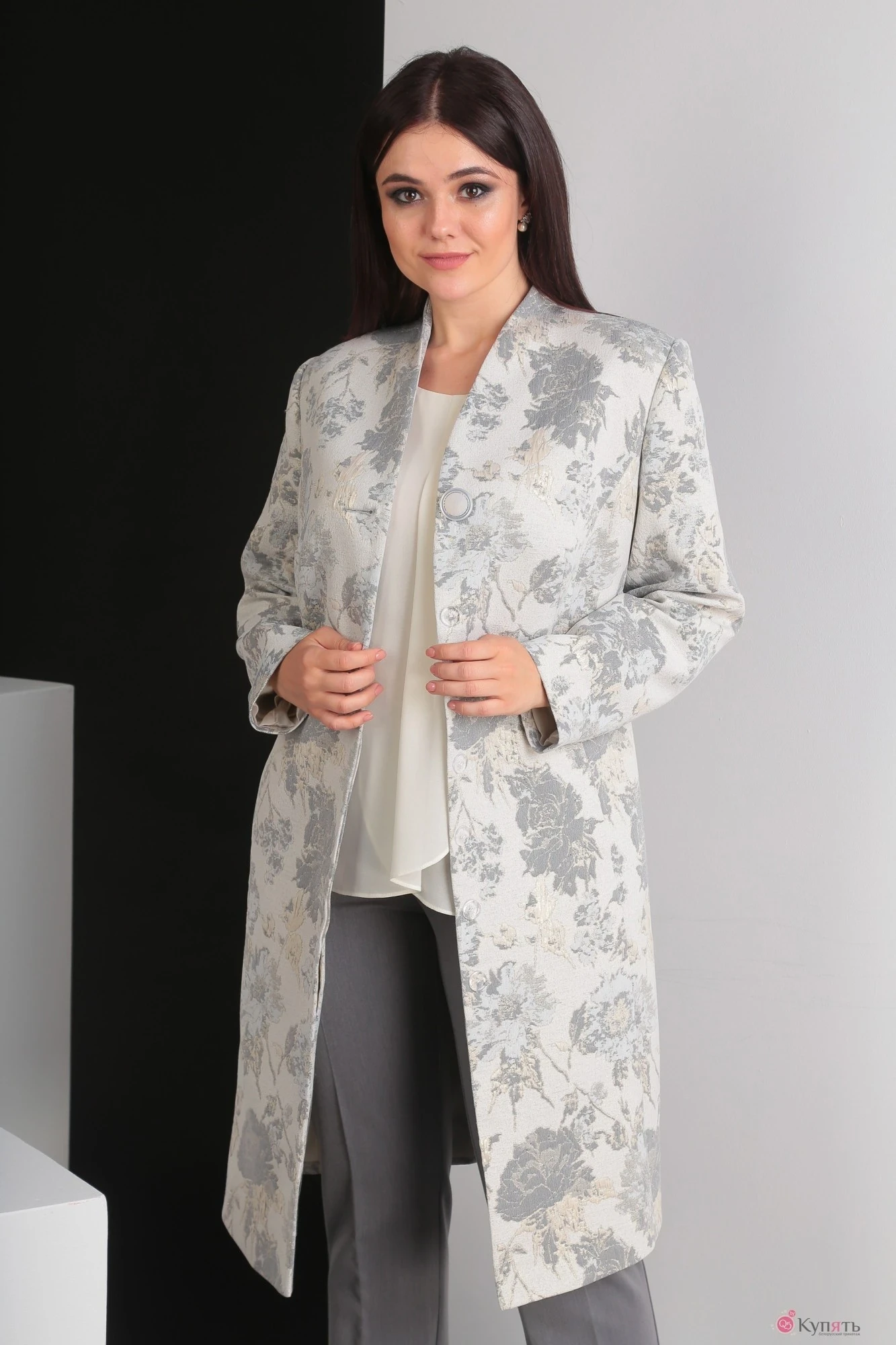 Стильный кардиган полуприлегающего силуэта. На полочке расположены рельефы, выходящие из проймы, с нагрудной вытачкой. Спинка со средним швом, который переходит в шлицу, и талиевыми вытачками. Рукав втачной двухшовный. Воротник-стойка. По переду в рельефах расположены карманы. Кардиган на подкладке.