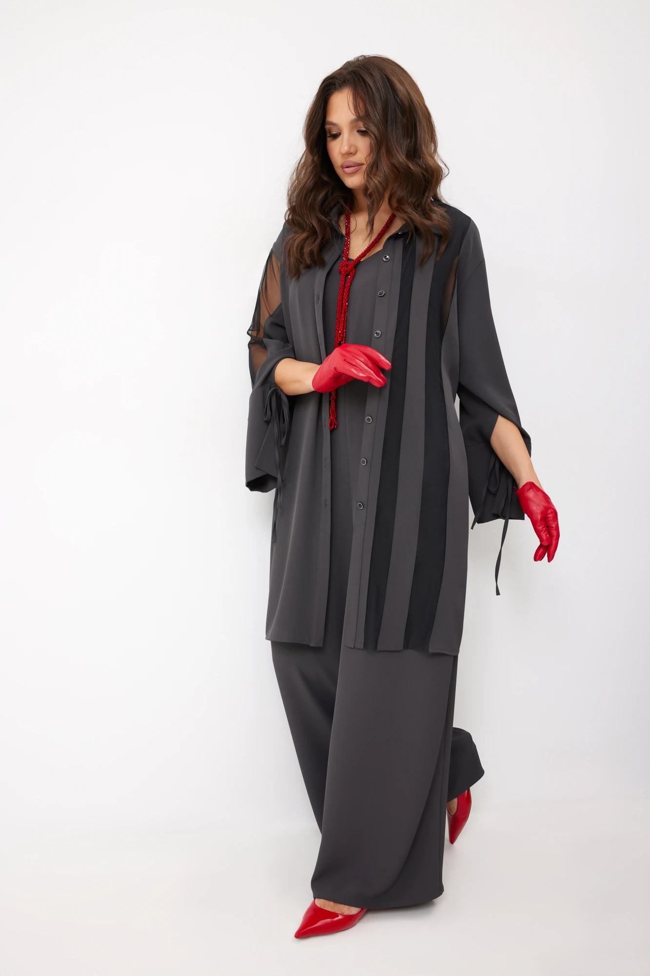 Размер 50: Блуза: ОГ-122, ОТ-122, ОБ-122, ширина плеча -19, длина рукава втачного-60, ширина рукава на уровне низа-16,5, длина изделия спинки по центру-92. Комбинезон: ОГ-106, ОТ-108, ОБ-116, ширина плеча-6,5, длина изделия спинки по боковому шву-121.
