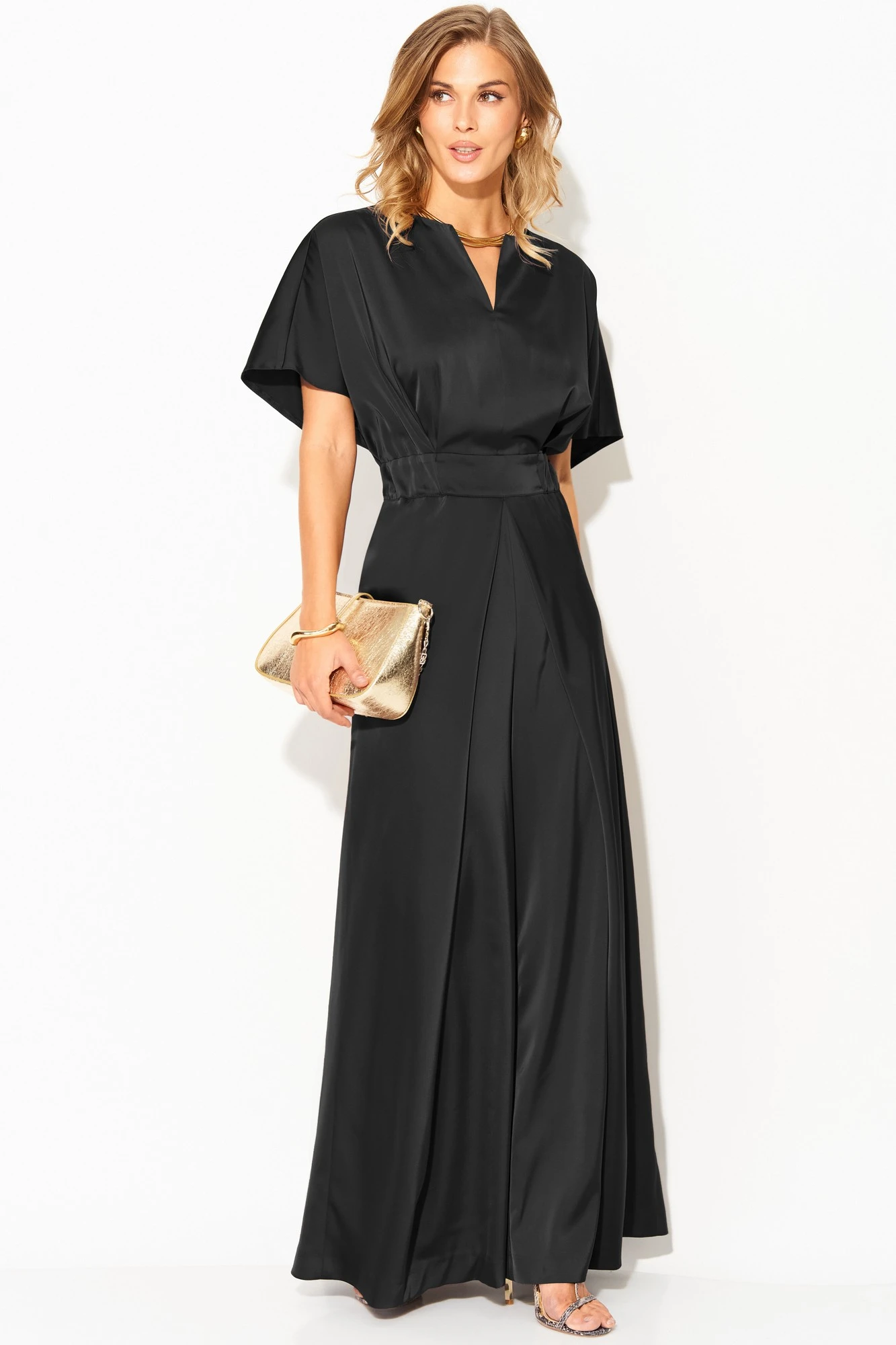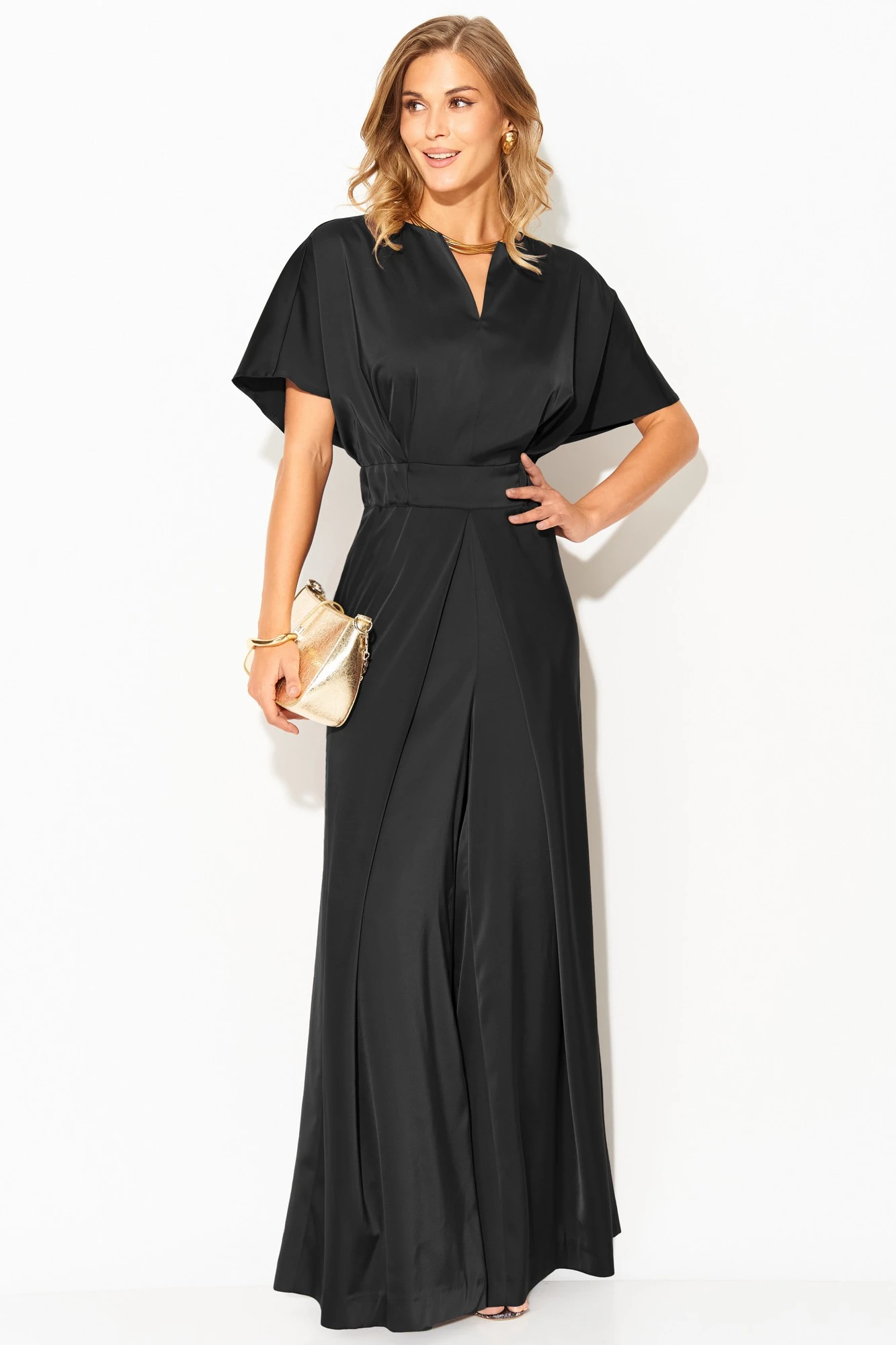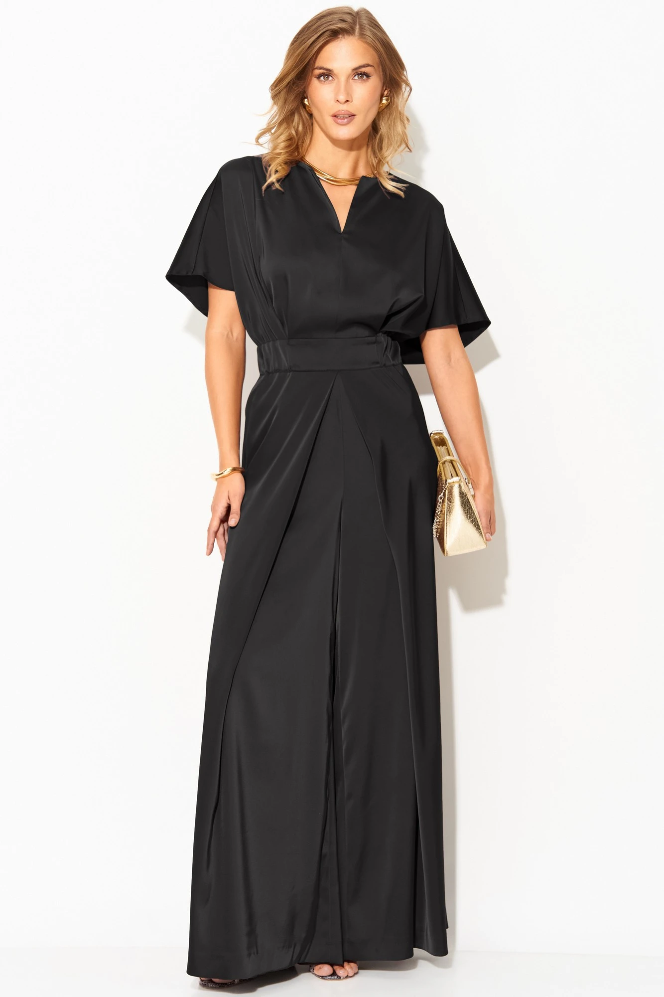 Комбинезон выполнен из атласа средней плотности, ткань не тянется.