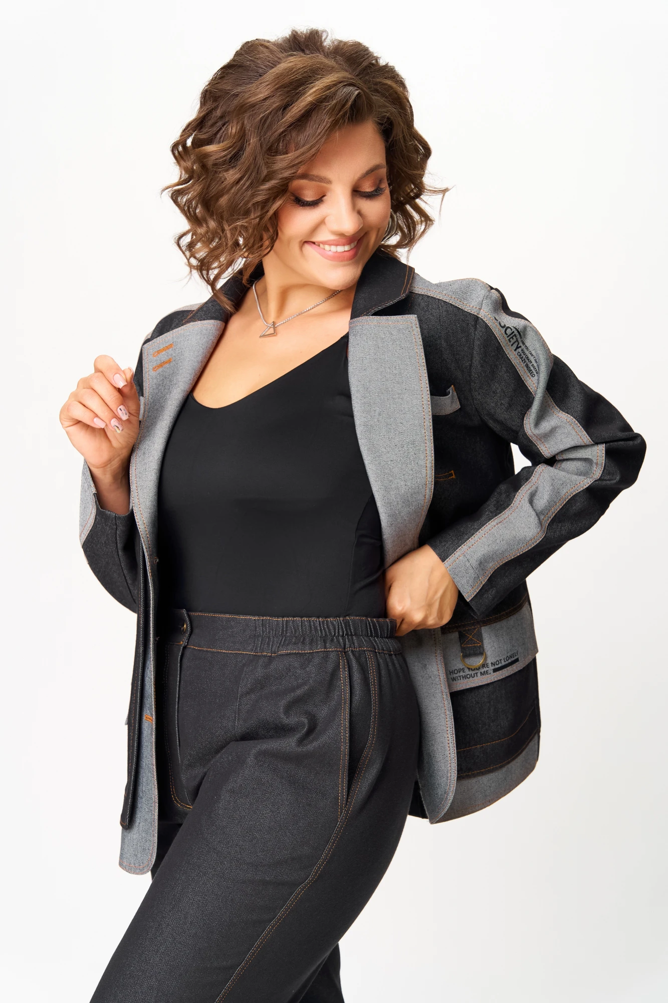 Жакет слегка приталенного кроя с контрастными вставками серого и оранжевого цветов. Оснащен металлическими пуговицами и накладными карманами с декоративными металлическими кольцами. На клапане и рукаве нанесена печать с надписью для индивидуального стиля. Брюки прямого покроя с аккуратными отворотами создают гармонию движения, делая силуэт стройнее и изящнее. Тонкая прострочка и контрастные элементы превращают костюм в стильный акцент гардероба, который будет уместен как в деловой среде, так и в повседневной жизни."