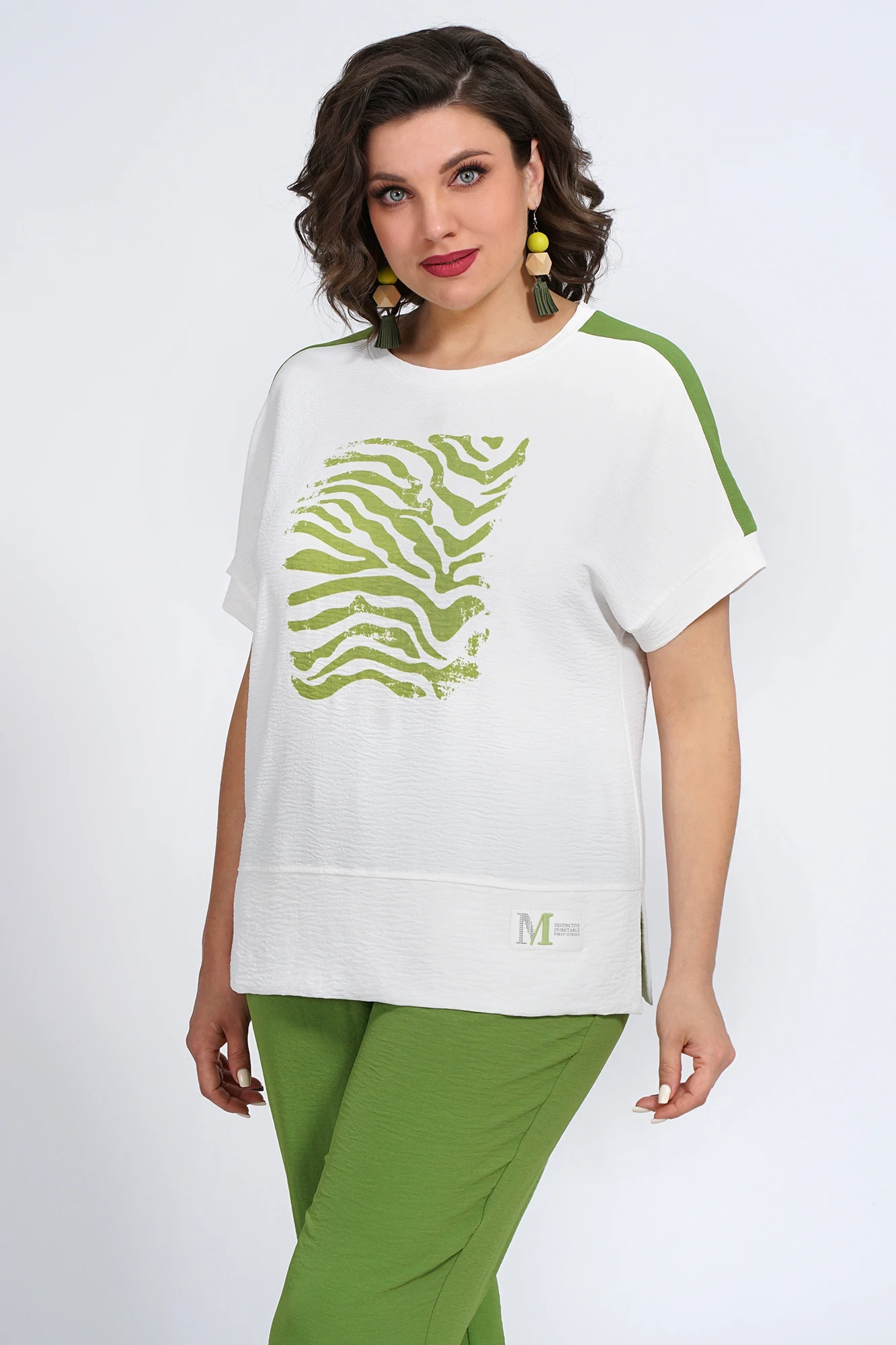 Блуза женская прямого, свободного силуэта, со спущенной линией плеча отрезная чуть выше линии бёдер, по боковым с разрезами. По плечевым переда притачная планка. Горловина круглой формы с втачной бейкой.