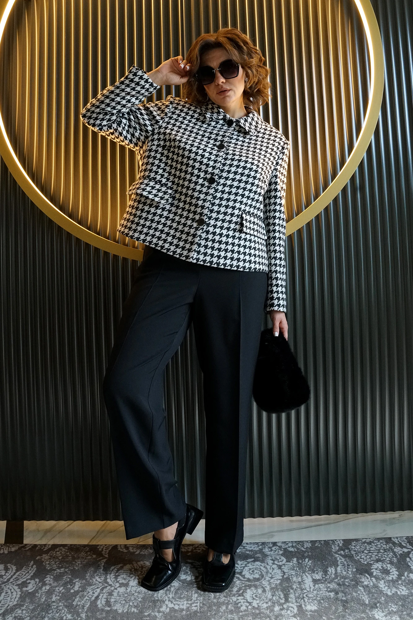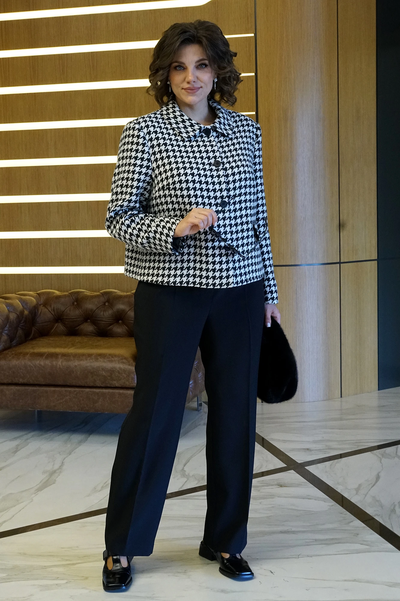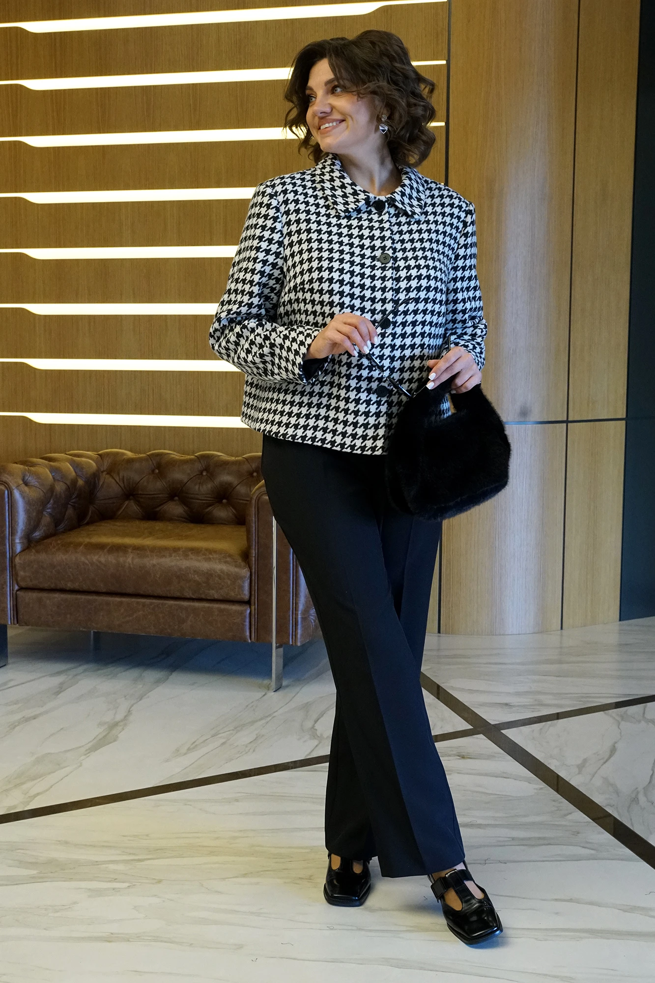 52, 54 , 56Брюки прямого силуэта, на притачном поясе со шлёвками, по боковым на резинке. Застежка типа «гульфик» на молнию и по краю пояса на петлю, пуговицу. Передние части с фигурными боковыми карманами. Задние части с притачной кокеткой.