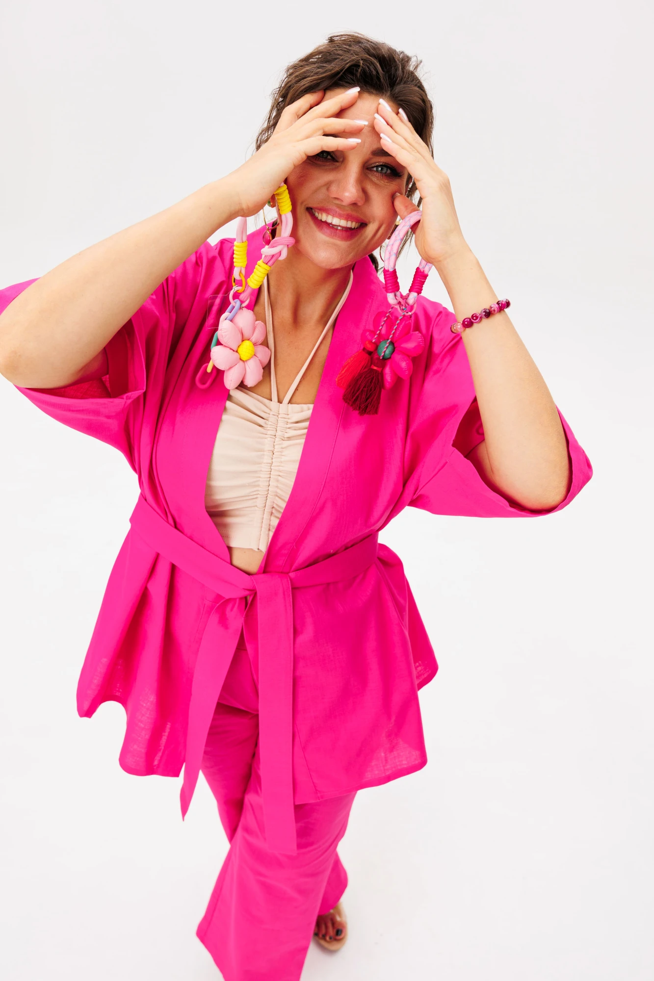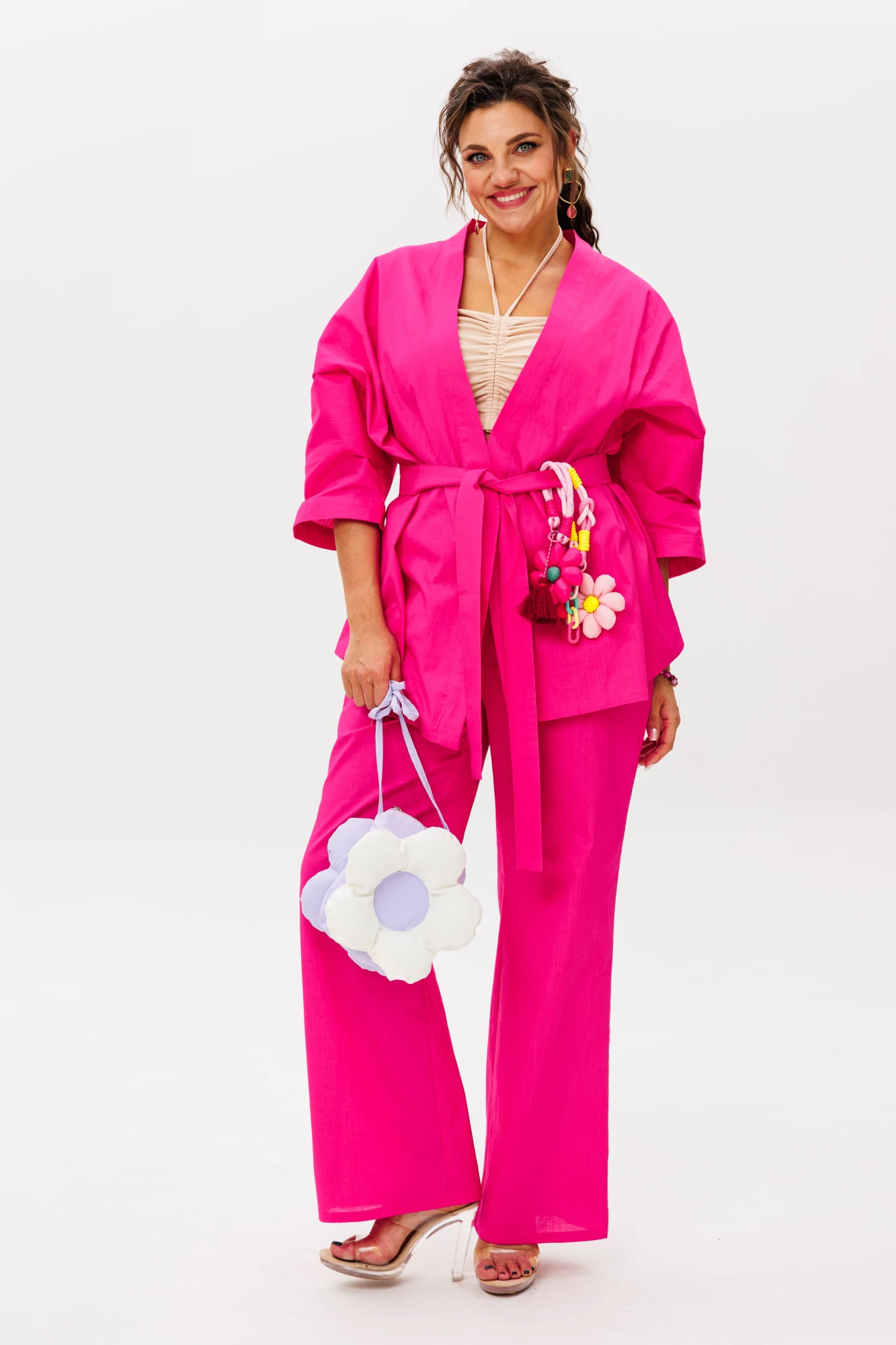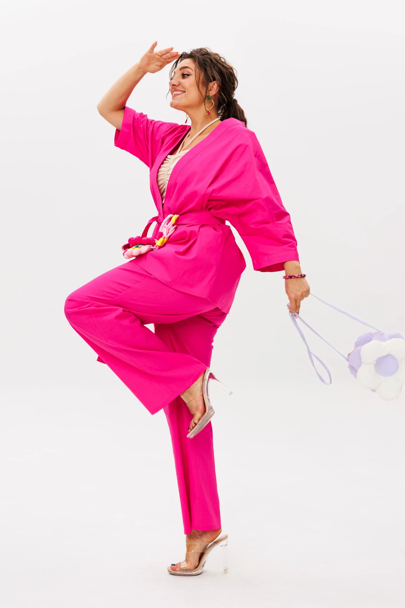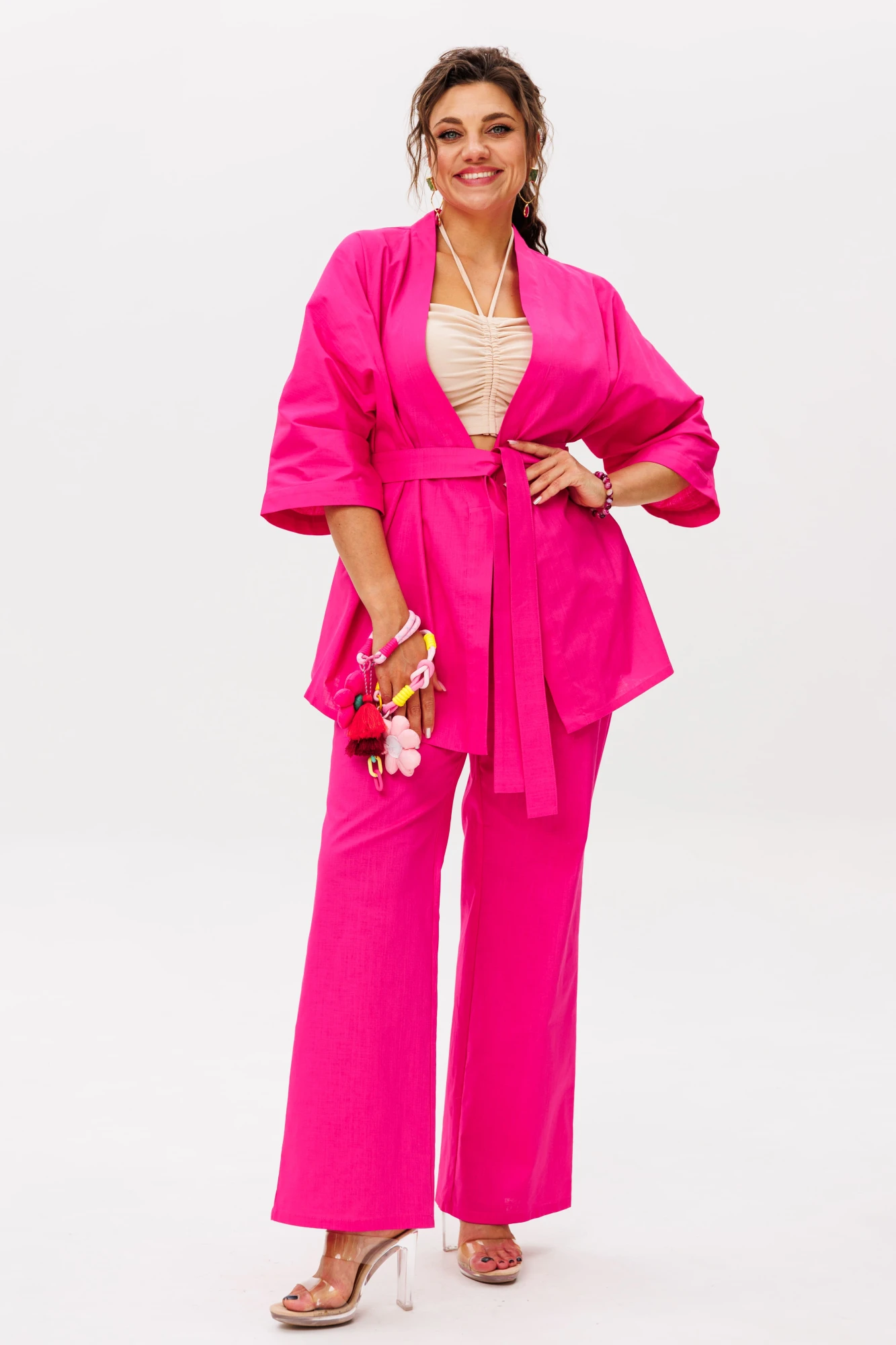 56Кимоно свободного кроя с фигурным запахом мягко драпируется, подчёркивая силуэт, но не сковывая его. Рукав 3/4 с широкой манжетой добавляет динамики, а отсутствие застёжек делает образ ещё более непринуждённым. Съёмный пояс позволяет варьировать степень выразительности.