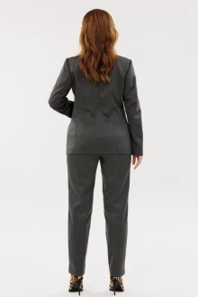 Однобортный жакет полуприталенного силуэта, на подкладке, с плечевыми накладками. Воротник пиджачного типа с отложными лацканами. По переду центральная застежка на петли и пуговицы и прорезные карманы с клапаном, талиевые вытачки и рельефы. Низ бортов закругленной формы. Спинка со средним швом и рельефами. Рукав втачной двухшовный длинный.