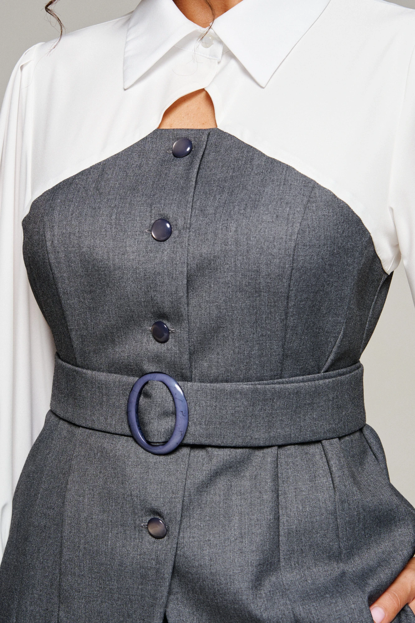 Верхняя часть (подрезная кокетка) спереди и сзади имитирует блузку, нижняя - жакет.