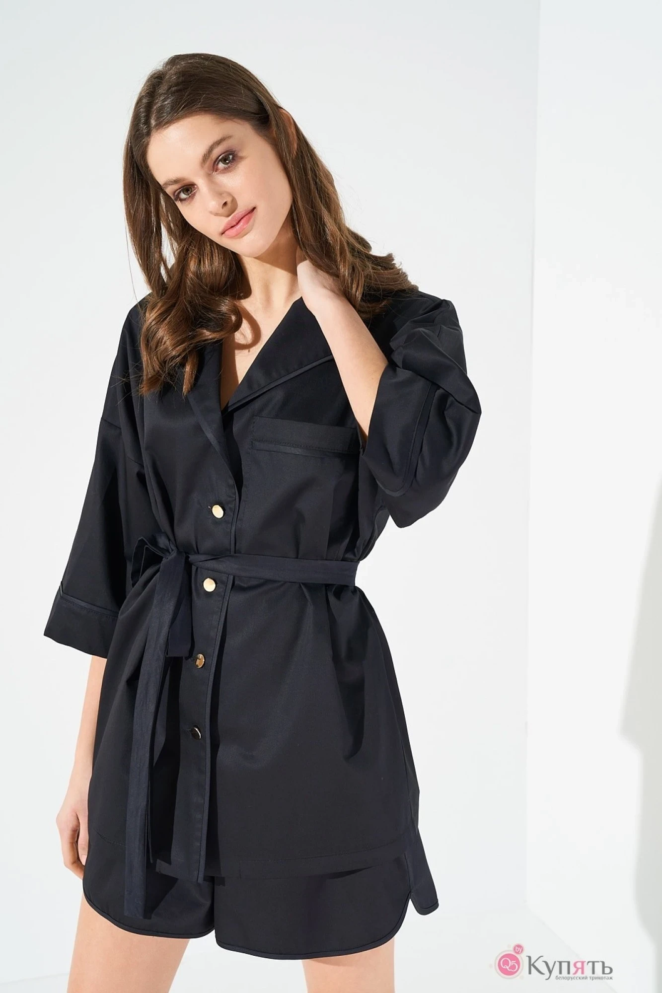 костюм женский 2- х предметный, из плательной ткани состоящий из рубашки и шорт. Рубашка с рукавом со спущенным плечом, по низу рукава манжет. Воротник пиджачного типа. Застежка центральная однобортная на 5 пуговиц . По переду рубашки карман накладной с кантом. Шорты расклешенные в боковых швах карманы, пояс на резинке.