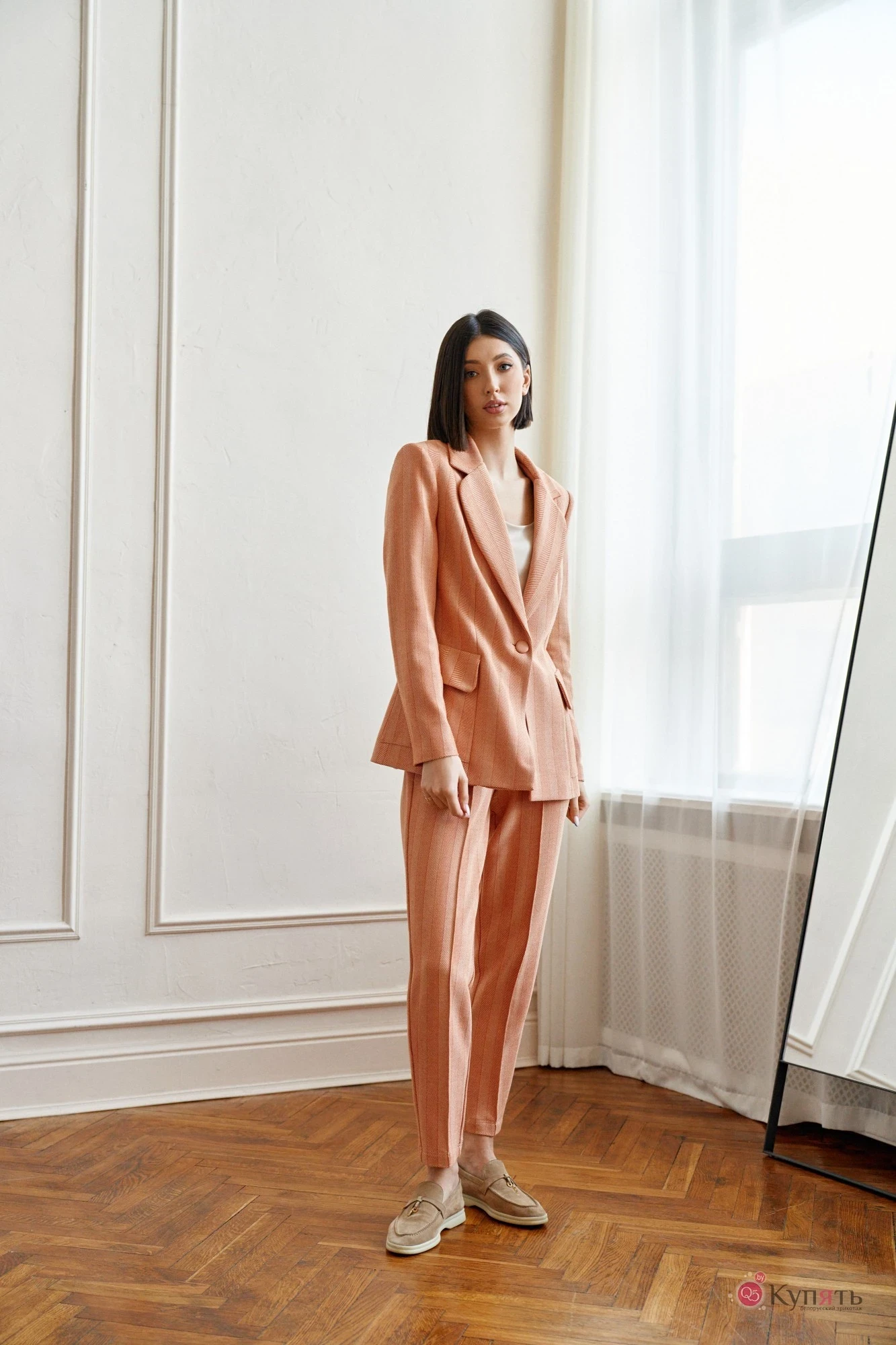Комплект женский двух предметный состоящий из жакета и брюк. Жакет приталенного силуэта на подкладке с подплечниками. Воротник пиджачного типа. Застежка пуговица по центру изделия. По переду нашиты крупные карманы. Рукав втачной одношовный. Брюки прямого кроя. Пояс брюк на резинке. По переду брюк застроченные стрелки. В боковых швах карманы. По заднему полотну брюк прорезной карман «обманка».