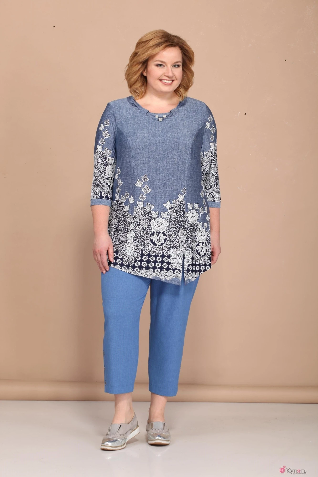 Комфортный женский комплект состоит из туники и брюк «капри». Туника свободного силуэта по переду рельефные швы, низ ассиметричный, в левом рельефном шве – разрез. Горловина круглая с отрезной планкой, по планке отделочные шнуры. Рукава втачные , с притачной манжетой по низу. Капри прямые к низу, по переду сверху и снизу брюк отрезные декоративные элементы с пуговицами. Верхний срез брюк оформлен притачным поясом с резинкой, застежка на молнию по линии «банта».