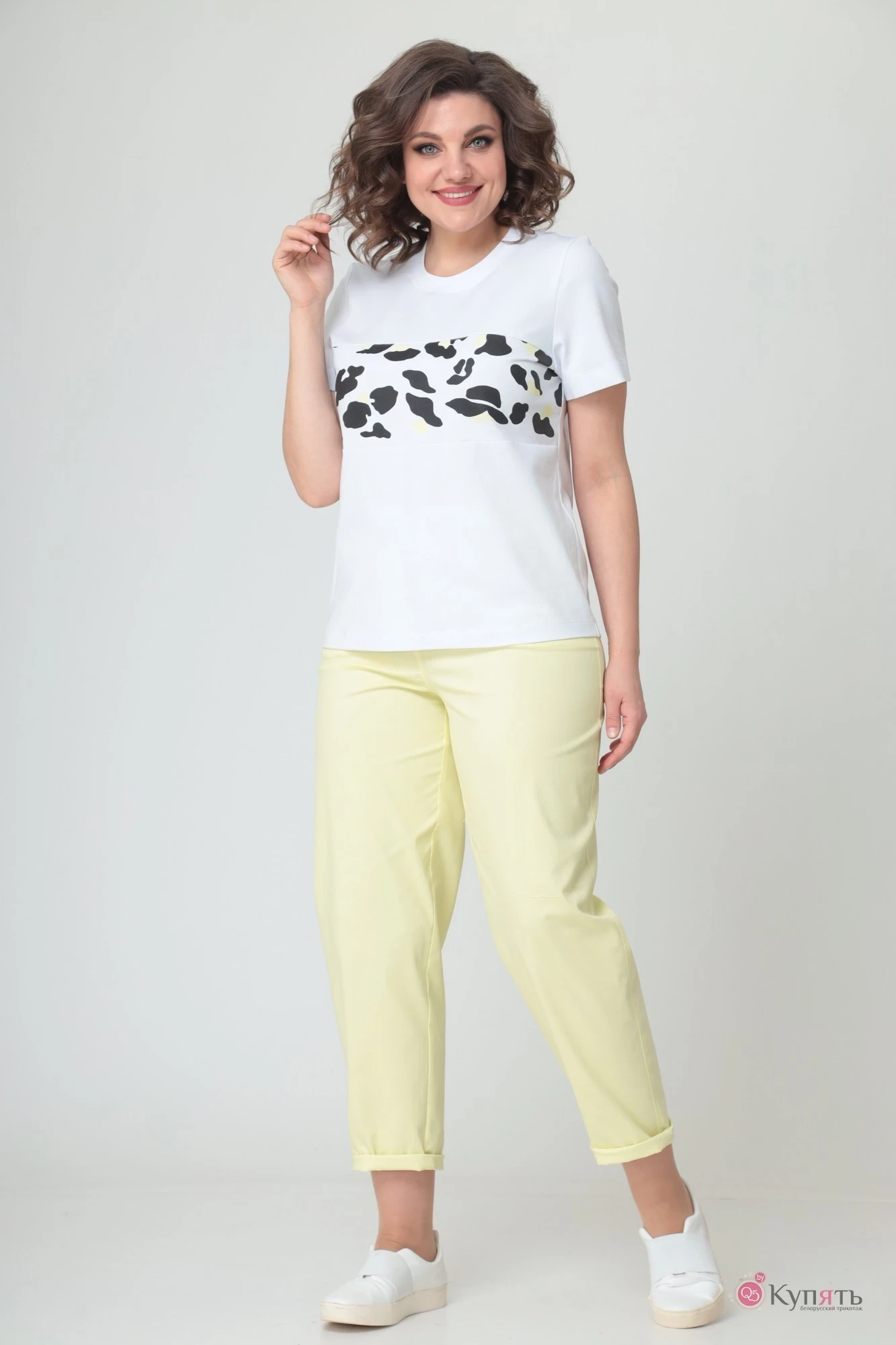 Майка полуприлегающего силуэта с принтом по переду, горловина круглая, рукава втачные.