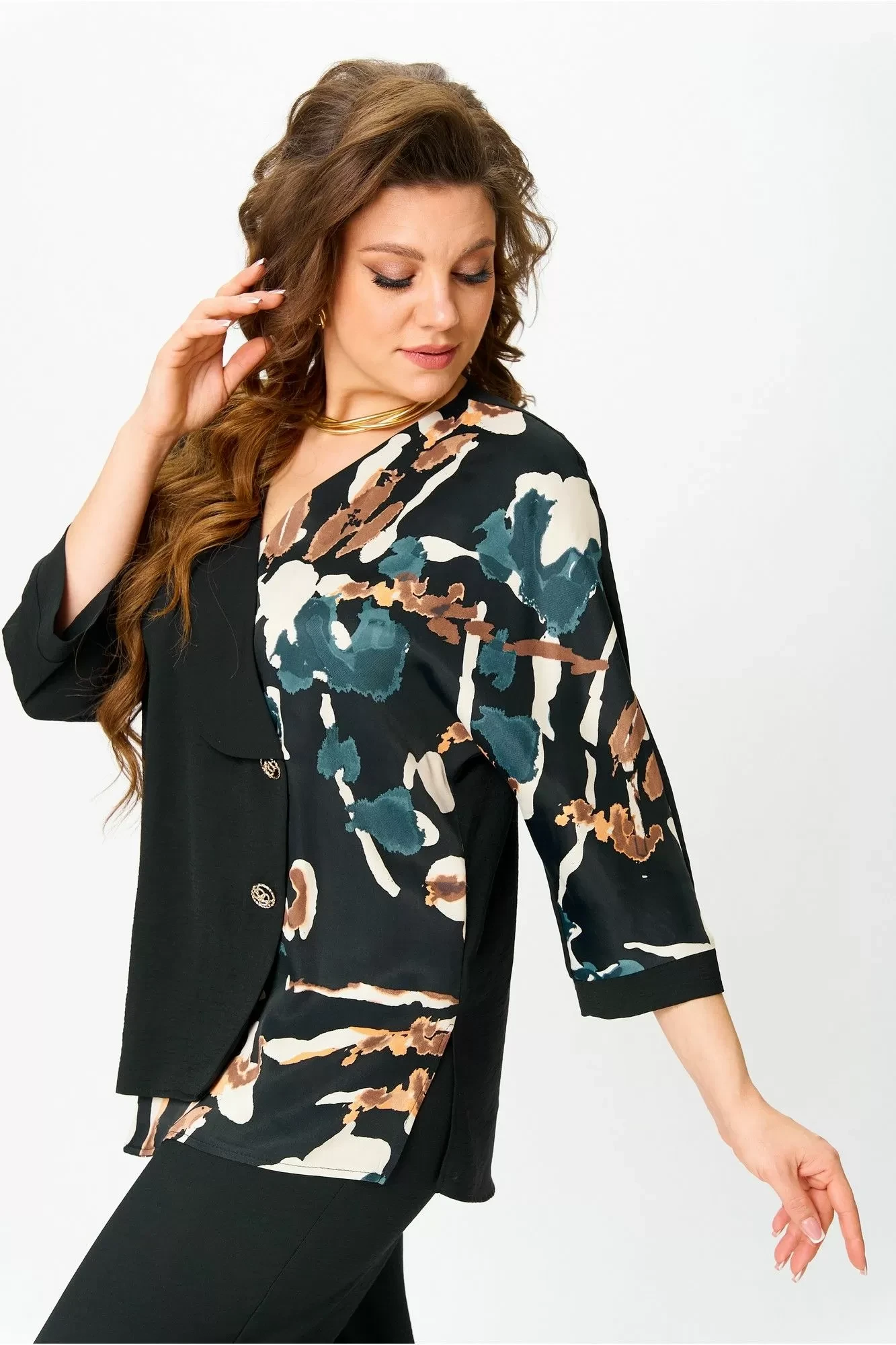 48,50, 52 , 54 ,56,58Блузон свободного силуэта с цельновыкроенным рукавом. По переду запах с V образной горловиной, на правой стороне горловины вставлен воротник, запах зафиксирован декоративными пуговицами, по низу рукава притачной манжет.