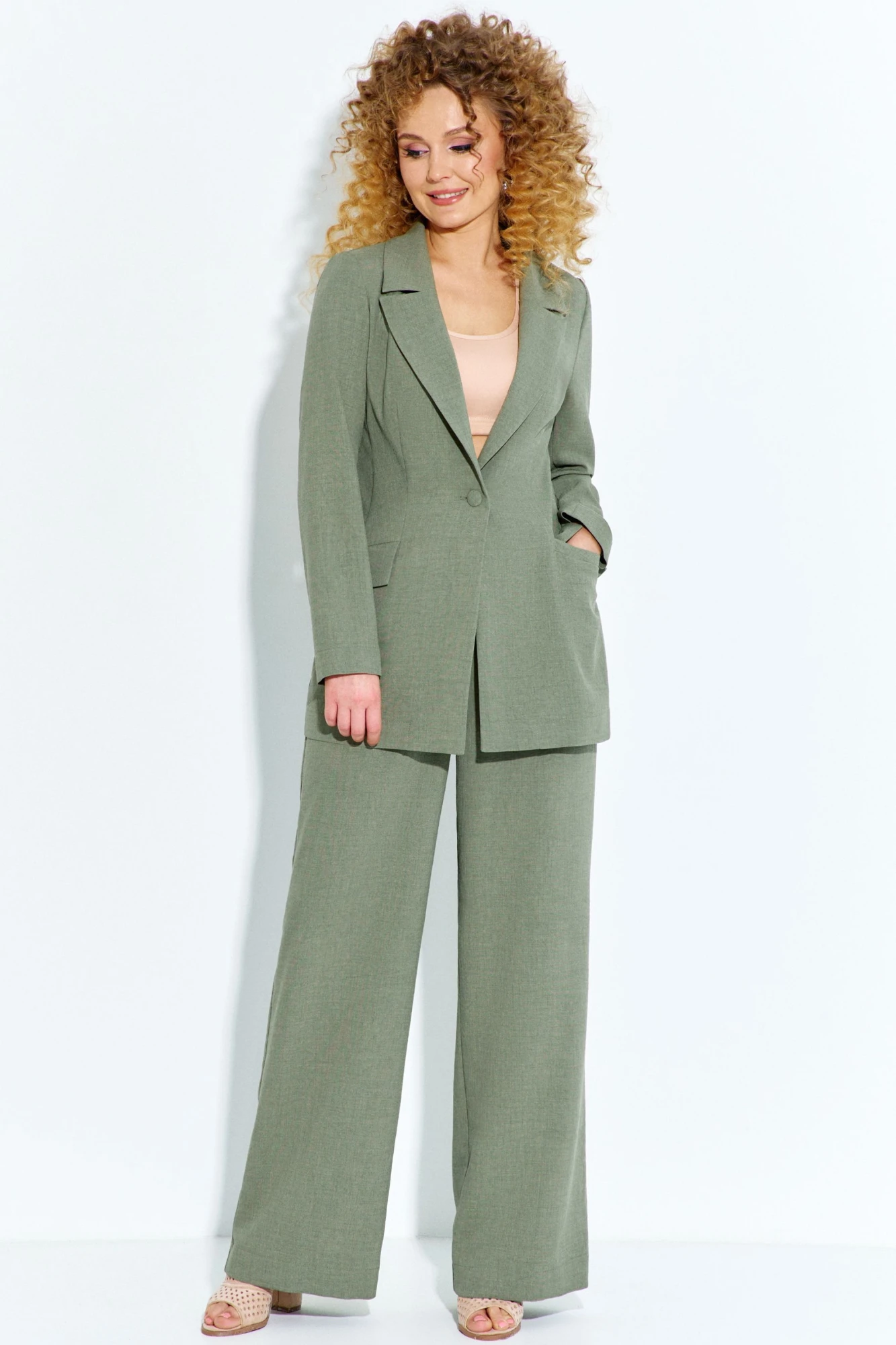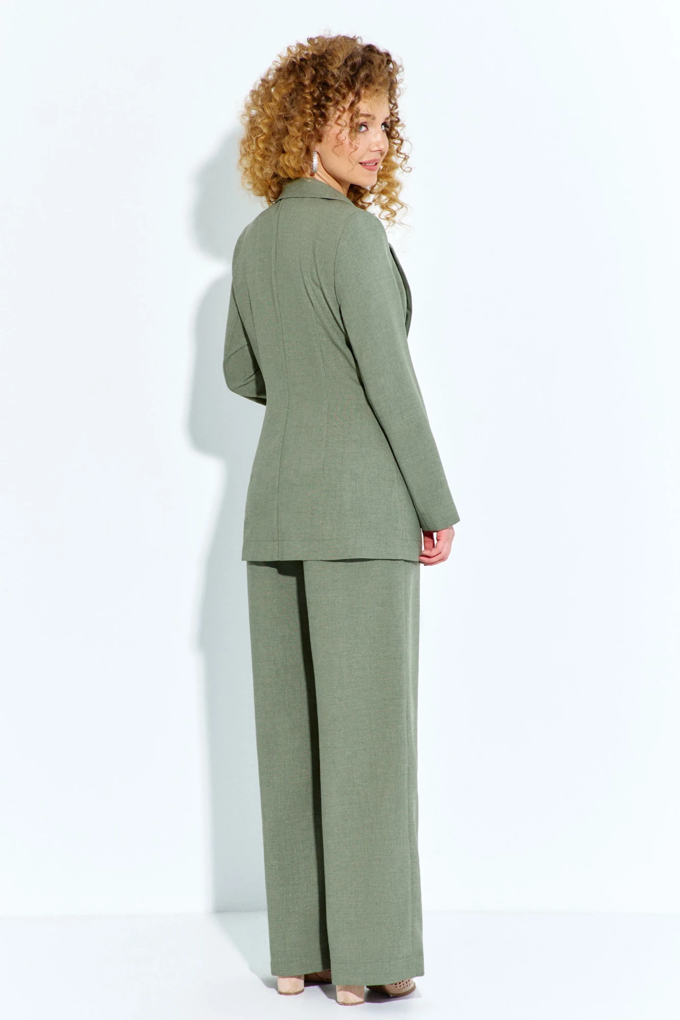 Костюм женский 2х предметный состоит из жакета и брюк. Жакет прилегающего кроя, по полочке жакета расположены прорезные карманы с клапанами. Горловина - отложной воротник с лацканами. Рукав втачной длинный. Застежка петля-пуговица. Брюки прямого кроя с высокой посадкой, на притачном поясе со вставками эластичной тесьмы. в боковых швах брюк -палаццо имеются карманы. Застежка молния на гульфике, петля-пуговица. Жакет без подкладки.