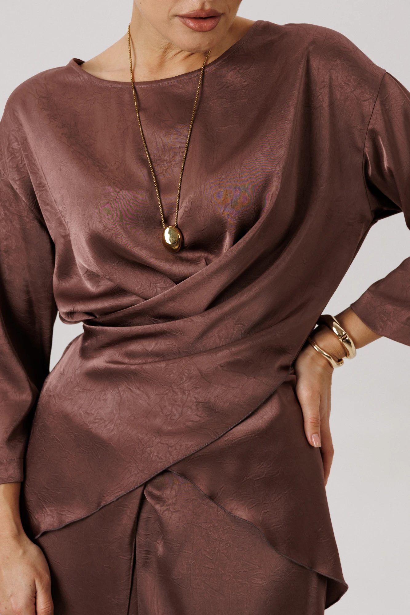 Невероятная блуза из одноимённой ткани завершает образ, превращая его в платье или даже комбинезон.