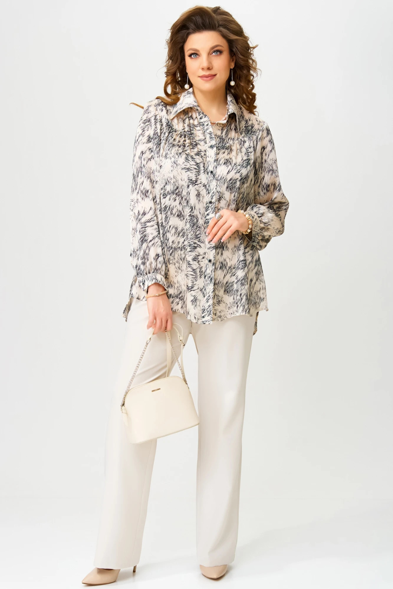 Женская блузка ""Хариса"" выполнена из текстильной ткани. Блузка прямого силуэта. Воротник отложной рубашечного типа на стойке, застежка на петли и пуговицы, планка отрезная. По спинке блузки кокетка, рукав в блузке втачной, по низку рукава манжет с застежкой на петлю и пуговицы. По полочке сборка и отрезная кокетка. Низ изделия обработан швом в подгибку с открытым срезом. В боковых швах блузки - разрезы.
