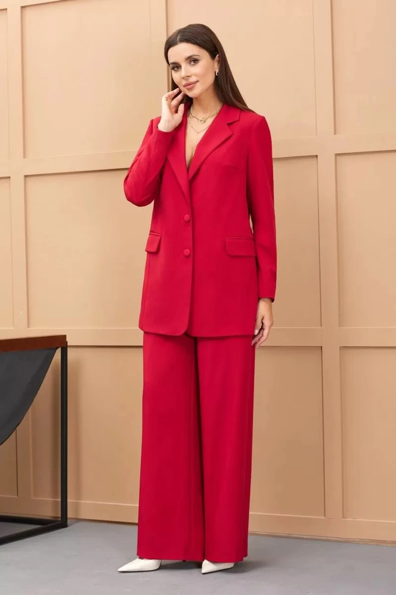 Жакет полуприлегающено силуэта ниже линии бёдер. Средний шов по спинке заканчивается шлицей.По переду обработанны рельефы. Карманы с клапаном и двумя обтачками. Борта в жакете закруглённые. Воротник отложной с лацканами. Рукава вточные гладкие. Жакет застёгивается на две петли пуговицы.